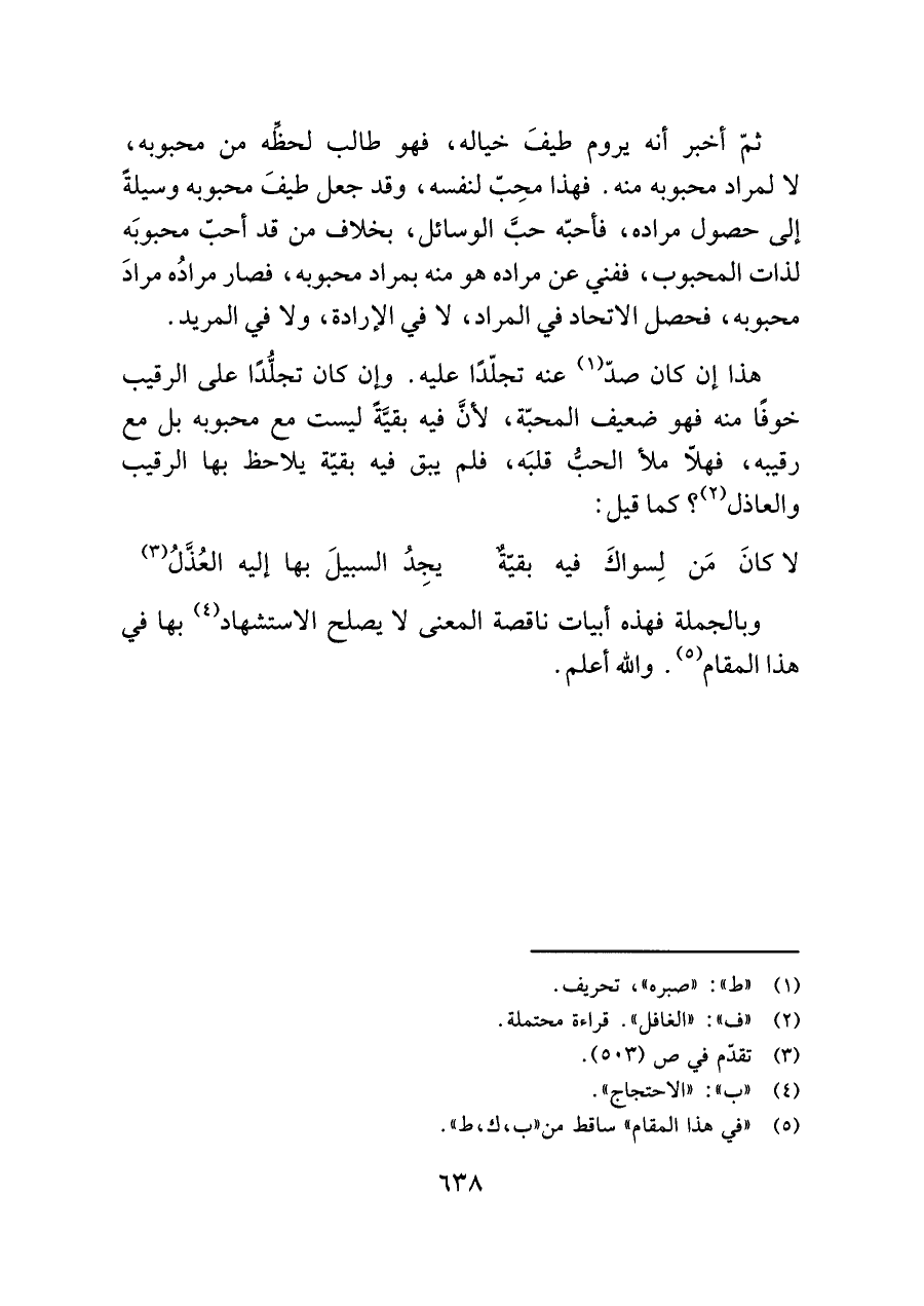 ثمّ أخبر أنه يروم طيفَ خياله، فهو طالب لحظِّه من محبوبه، لا لمراد محبوبه منه. فهذا محِبّ لنفسه، وقد جعل طيفَ محبوبه وسيلةً إلى حصول مراده، فأحبّه حبَّ الوسائل، بخلاف من قد أحبّ محبوبَه لذات المحبوب، ففني عن مراده هو منه بمراد محبوبه، فصار مرادُه مرادَ محبوبه، فحصل الاتحاد في المراد، لا في الإرادة، ولا في المريد.