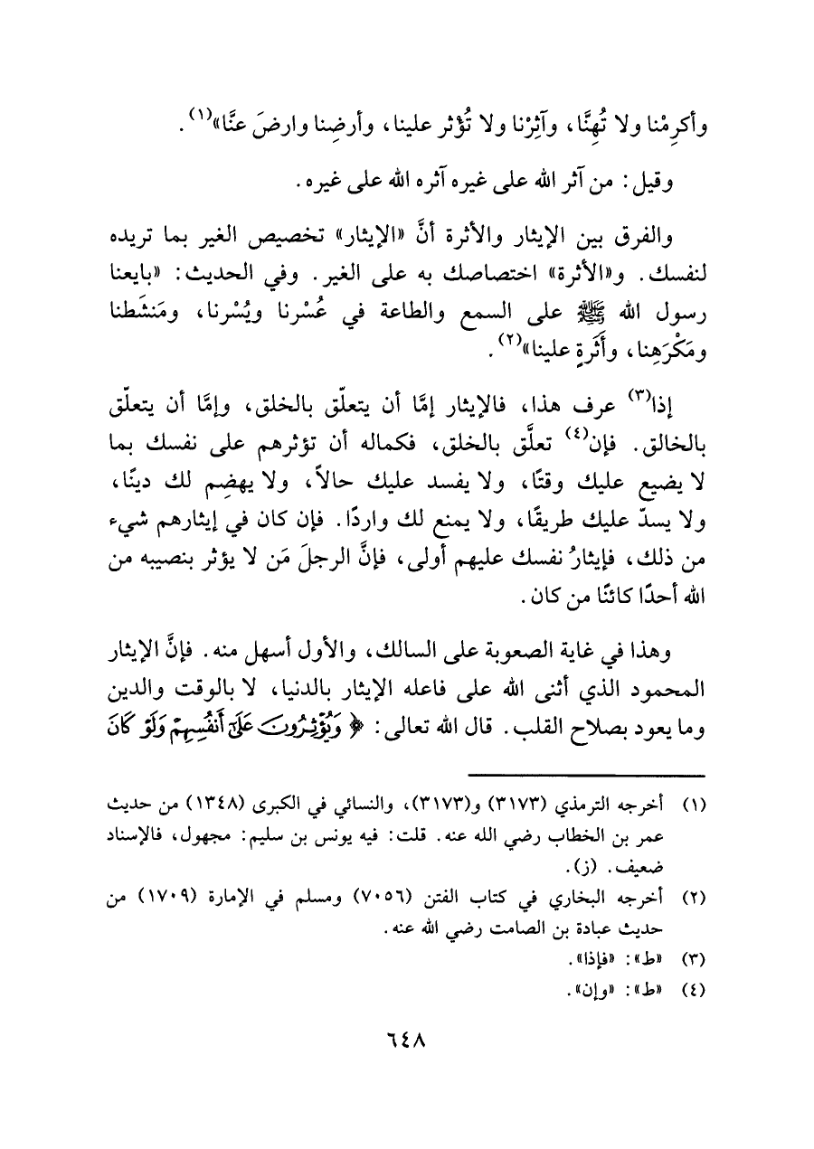 وهذا في غاية الصعوبة على السالك، والأول أسهل منه. فإنَّ الإيثار المحمود الذي أثنى اللَّه على فاعله الإيثار بالدنيا، لا بالوقت والدين وما يعود بصلاح القلب. قال اللَّه تعالى: {وَيُؤْثِرُونَ عَلَى أَنْفُسِهِمْ وَلَوْ كَانَ