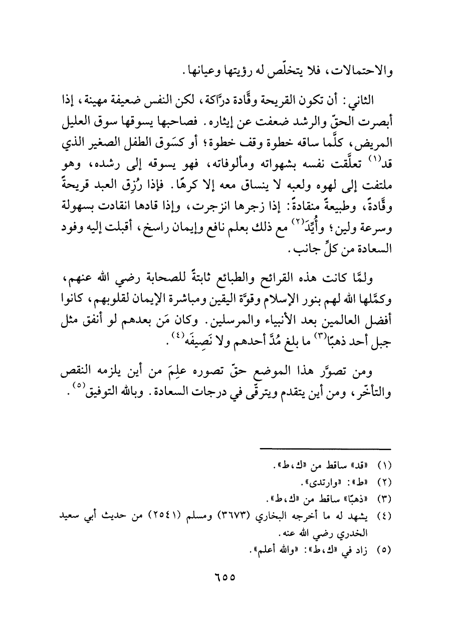 الثاني: أن تكون القريحة وفَّادة درَّاكة، لكن النفس ضعيفة مهينة، إذا أبصرت الحقّ والرشد ضعفت عن إيثاره. فصاحبها يسوقها سوق العليل المريض، كلَّما ساقه خطوة وقف خطوة؛ أو كسَوق الطفل الصغير الذي قد (¬١) تعلَّقت نفسه بشهواته ومألوفاته، فهو يسوقه إلى رشده، وهو ملتفت إلى لهوه ولعبه لا ينساق معه إلا كرهًا. فإذا رُزِق العبد قريحةً وفَّادةً، وطبيعةً منقادةً: إذا زجرها انزجرت، وإذا قادها انقادت بسهولة وسرعة ولين؛ وأُيِّدَ (¬٢) مع ذلك بعلم نافع وإيمان راسخ، أقبلت إليه وفود السعادة من كلِّ جانب.