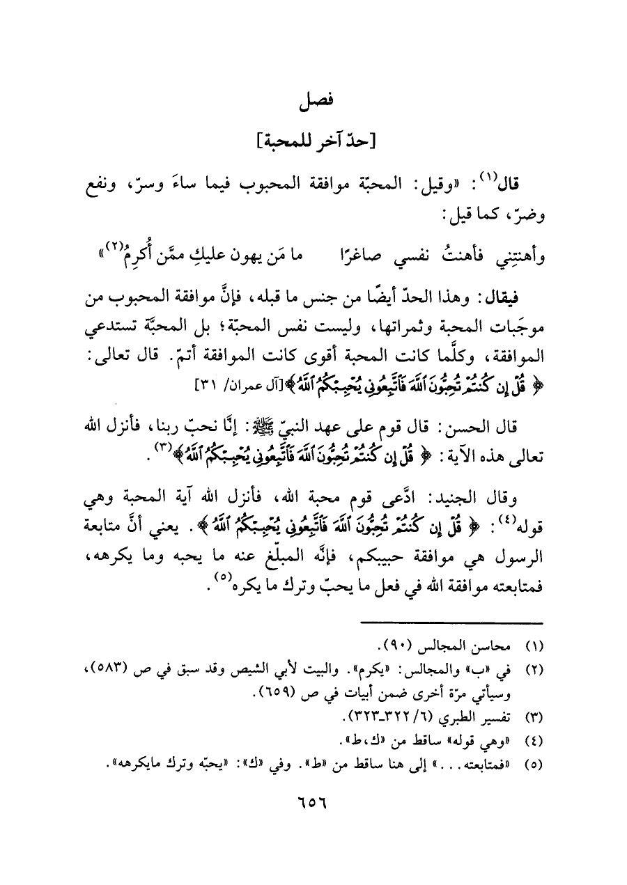 فيقال: وهذا الحدّ أيضًا من جنس ما قبله، فإنَّ موافقة المحبوب من موجَبات المحبة وثمراتها، وليست نفس المحبّة؛ بل المحبَّة تستدعي الموافقة، وكلَّما كانت المحبة أقوى كانت الموافقة أتمّ. قال تعالى: {قُلْ إِنْ كُنْتُمْ تُحِبُّونَ اللَّهَ} [آل عمران/ ٣١].
