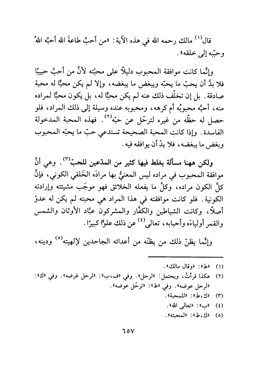ولكن ههنا مسألة يغلط فيها كثير من المدّعين للحبّ (¬٣). وهي أنَّ موافقة المحبوب في مراده ليس المعنيُّ بها مرادَه الخَلقي الكوني، فإنَّ كلَّ الكون مراده، وكلَّ ما يفعله الخلائق فهو موجَب مشيئته وإرادته الكونية. فلو كانت موافقته في هذا المراد هي محبته لم يكن له عدوّ أصلًا، وكانت الشياطين والكفَّار والمشركون عبَّاد الأوثان والشمس والقمر أولياءَه وأحبابه، تعالى (¬٤) عن ذلك علوًّا كبيرًا.