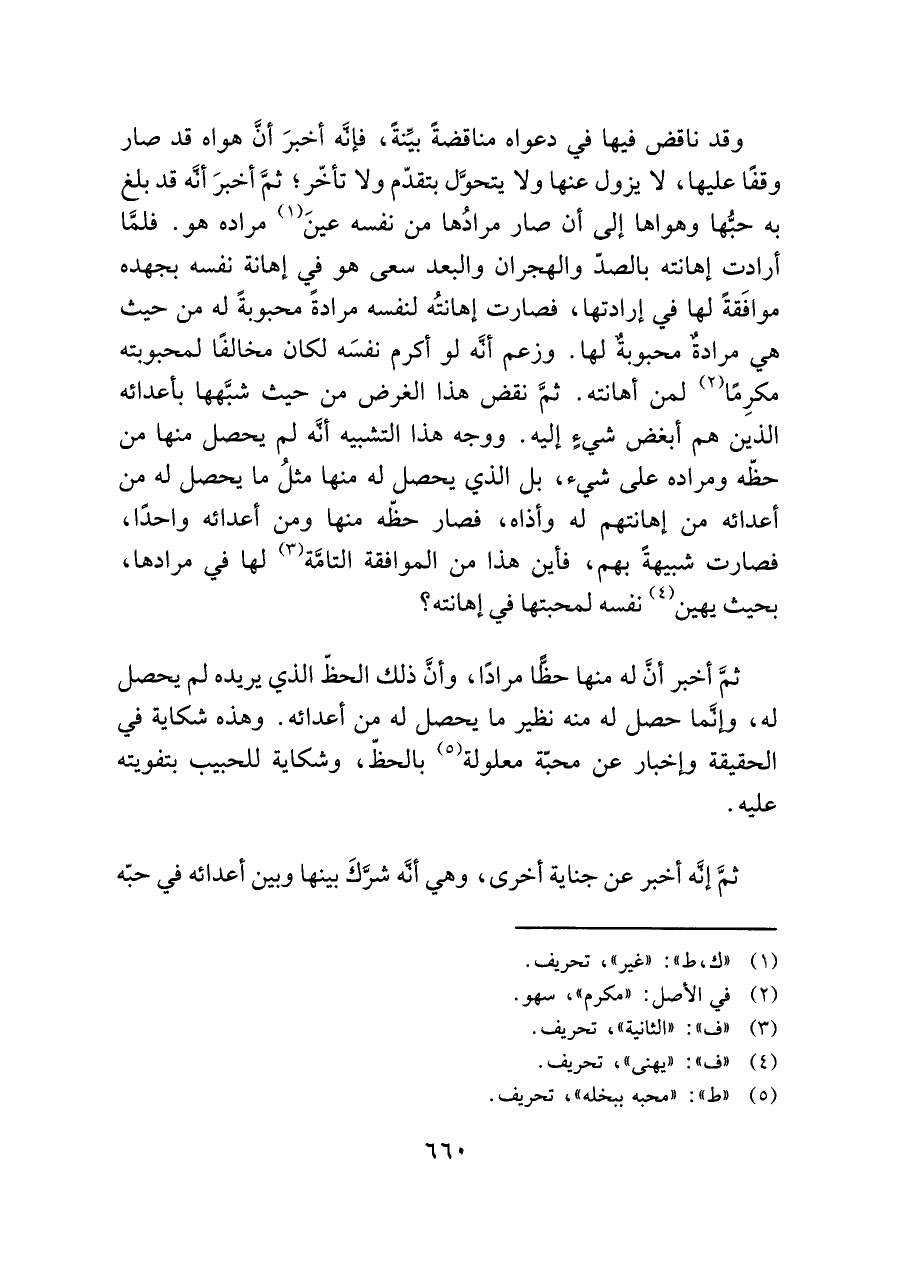 ثمَّ أخبر أنَّ له منها حظًّا مرادًا، وأنَّ ذلك الحظّ الذي يريده لم يحصل له، وإنَّما حصل له منه نظير ما يحصل له من أعدائه. وهذه شكاية في الحقيقة وإخبار عن محبّة معلولة (¬٥) بالحظّ، وشكاية للحبيب بتفويته عليه.
