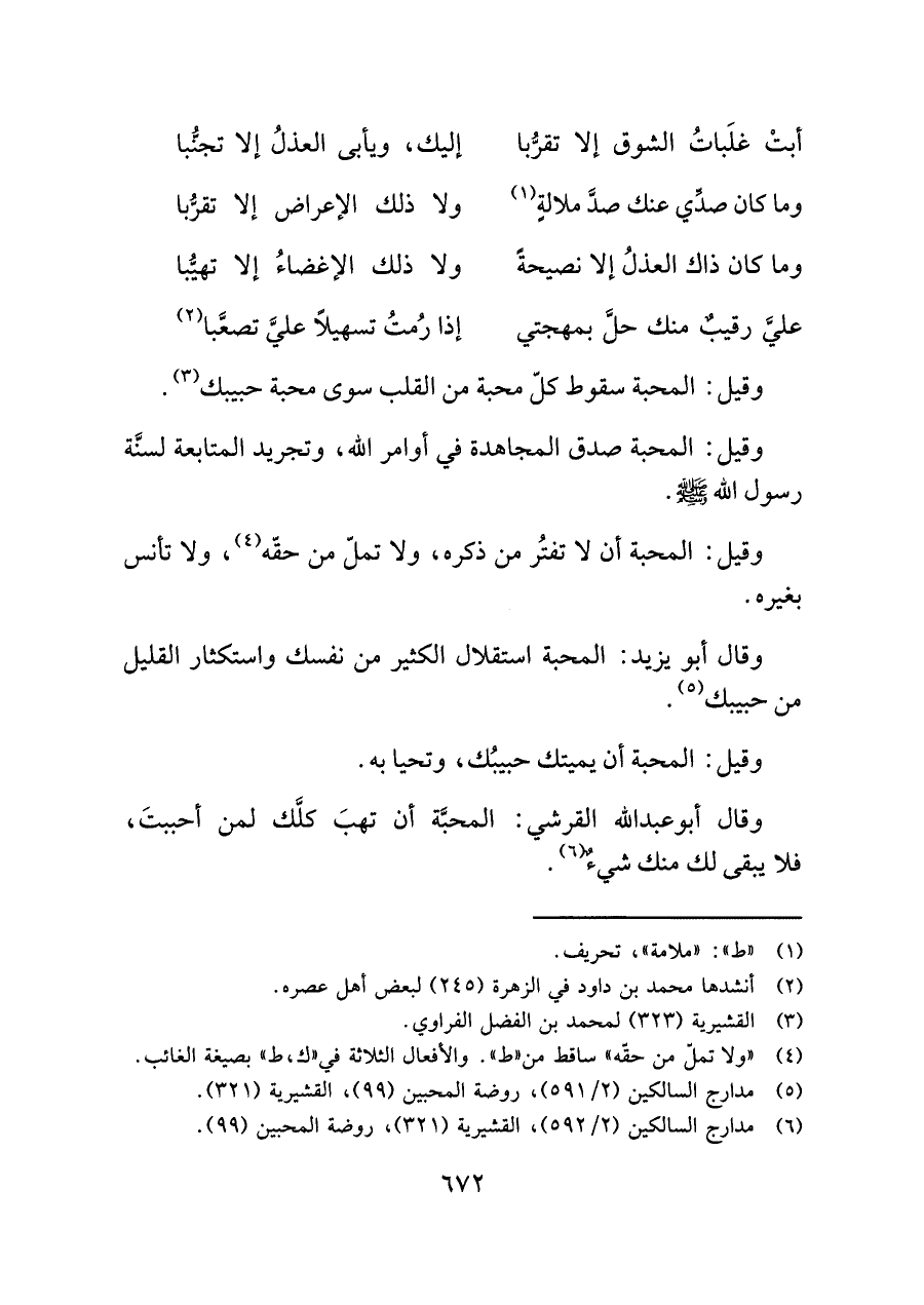 (¬٦) مدارج السالكين (٢/ ٥٩٢)، القشيرية (٣٢١)، روضة المحبين (٩٩).