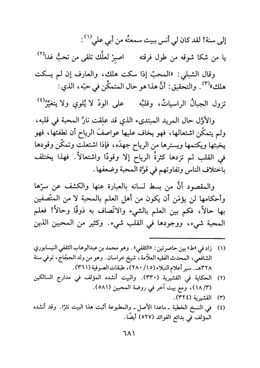 (¬٢) الحكاية في القشيرية (٣٣٠). والبيت أنشده المؤلف في مدارج السالكين (٣/ ١٨)، ومع بيت آخر في روضة المحبين (٥٨١).