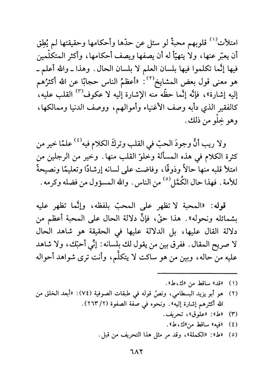 ولا ريب أنَّ وجودَ الحبّ في القلب وتركَ الكلام فيه (¬٤) علمًا خير من كثرة الكلام في هذه المسألة وخلوّ القلب منها. وخير من الرجلين من امتلأ قلبه منها حالًا وذوقًا، وفاضت على لسانه إرشادًا وتعليمًا ونصيحةً للأمة. فهذا حال الكُمَّل (¬٥) من الناس. واللَّه المسؤول من فضله وكرمه.