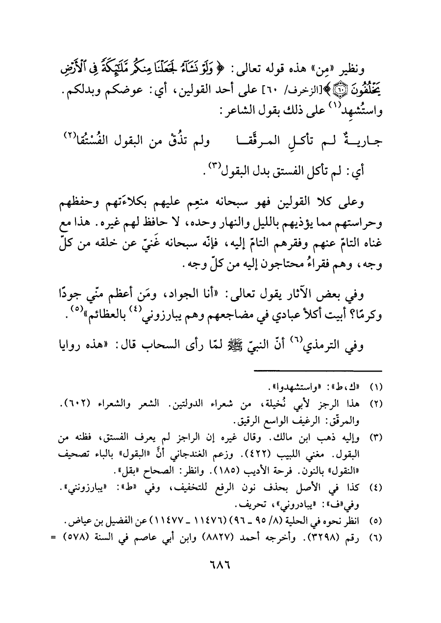 (¬٣) وإليه ذهب ابن مالك. وقال غيره إن الراجز لم يعرف الفستق، فظنه من البقول. مغني اللبيب (٤٢٢). وزعم الغندجاني أنَّ "البقول" بالباء تصحيف البقول. بالنون. فرحة الأديب (١٨٥). وانظر: الصحاح "بقل".