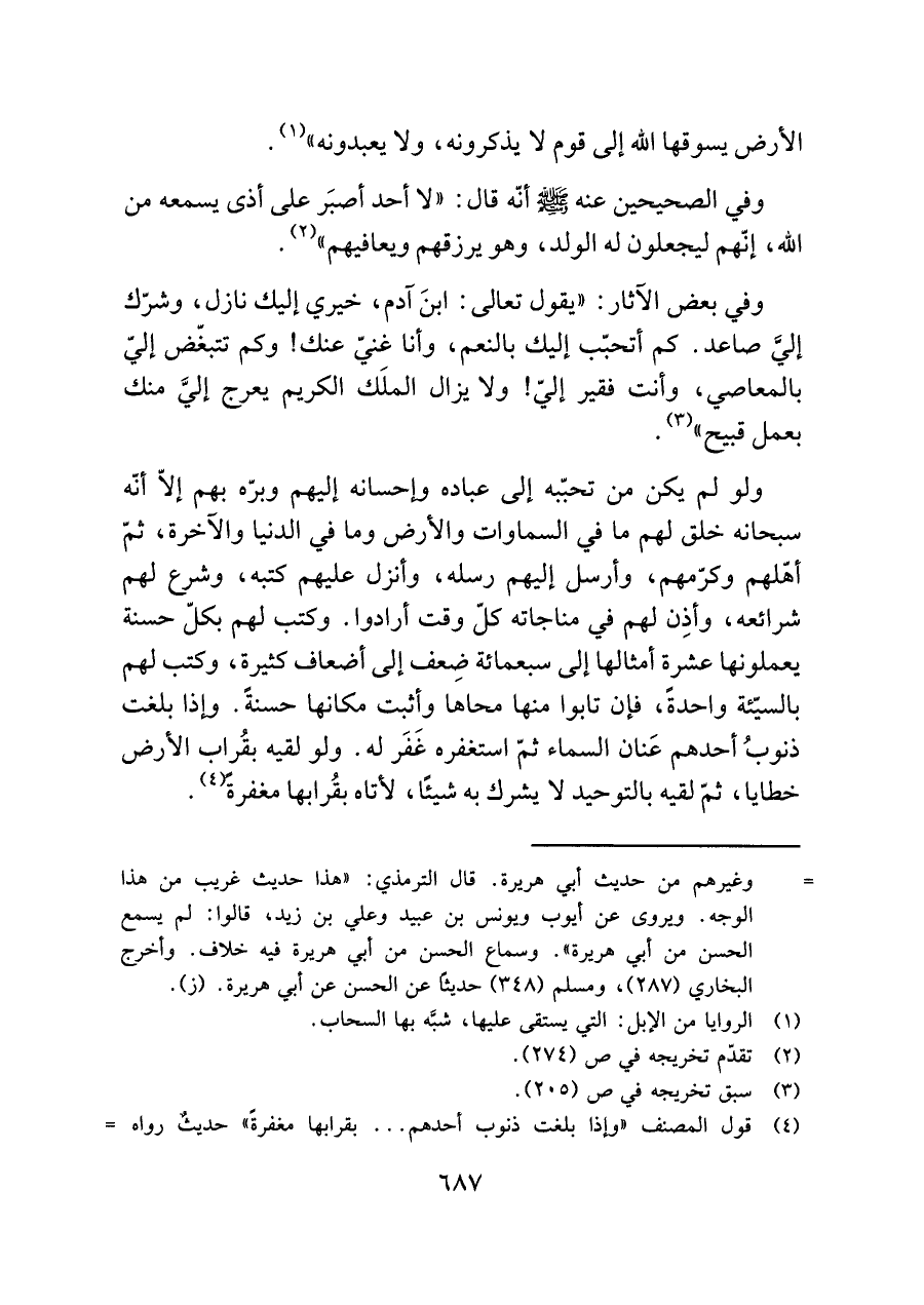 ولو لم يكن من تحبّبه إلى عباده وإحسانه إليهم وبرّه بهم إلّا أنّه سبحانه خلق لهم ما في السماوات والأرض وما في الدنيا والآخرة، ثمّ أقلهم وكرّمهم، وأرسل إليهم رسله، وأنزل عليهم كتبه، وشرع لهم شرائعه، وأذِن لهم في مناجاته كلّ وقت أرادوا. وكتب لهم بكلّ حسنة يعملونها عشرة أمثالها إلى سبعمائة ضِعف إلى أضعاف كثيرة، وكتب لهم بالسيّئة واحدةً، فإن تابوا منها محاها وأثبت مكانها حسنةً. وإذا بلغت ذنوبُ أحدهم عَنان السماء ثمّ استغفره غَفَر له. ولو لقيه بقُراب الأرض خطايا، ثمّ لقيه بالتوحيد لا يشرك به شيئًا، لأتاه بقُرابها مغفرة (¬٤).