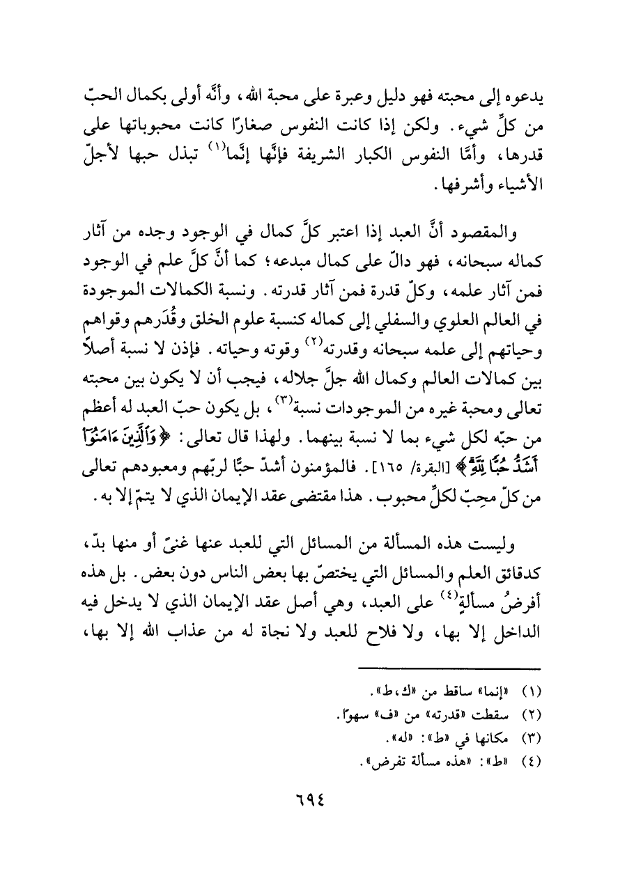 والمقصود أنَّ العبد إذا اعتبر كلَّ كمال في الوجود وجده من آثار كماله سبحانه، فهو دالّ على كمال مبدعه؛ كما أنَّ كل علم في الوجود فمن آثار علمه، وكلّ قدرة فمن آثار قدرته. ونسبة الكمالات الموجودة في العالم العلوي والسفلي إلى كماله كنسبة علوم الخلق وقُدَرهم وقواهم وحياتهم إلى علمه سبحانه وقدرته (¬٢) وقوته وحياته. فإذن لا نسبة أصلًا بين كمالات العالم وكمال اللَّه جلَّ جلاله، فيجب أن لا يكون بين محبته تعالى ومحبة غيره من الموجودات نسبة (¬٣)، بل يكون حبّ العبد له أعظم من حبّه لكل شيء بما لا نسبة بينهما. ولهذا قال تعالى: {وَالَّذِينَ آمَنُوا أَشَدُّ حُبًّا لِلَّهِ} [البقرة/ ١٦٥]. فالمؤمنون أشدّ حبًّا لربهم ومعبودهم تعالى من كلّ محِبّ لكلِّ محبوب. هذا مقتضى عقد الإيمان الذي لا يتمّ إلا به.