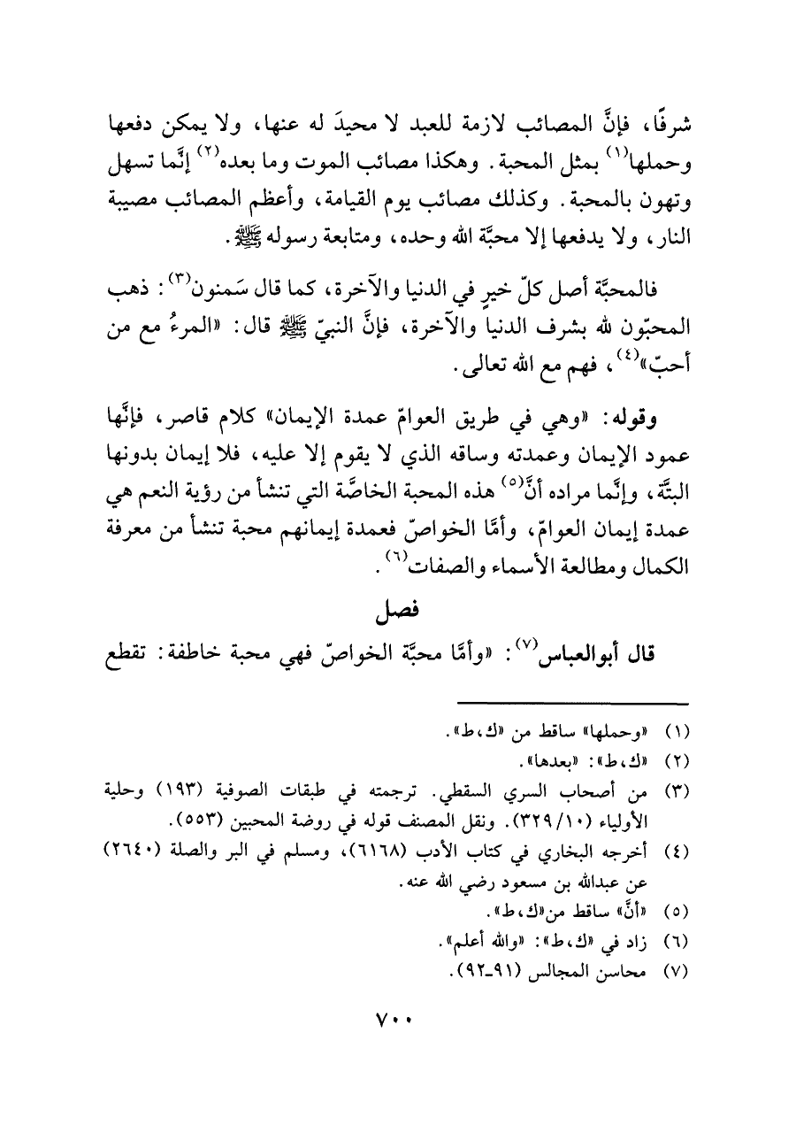 قال أبو العباس (¬٧): "وأمَّا محبَّة الخواصّ فهي محبة خاطفة: تقطع