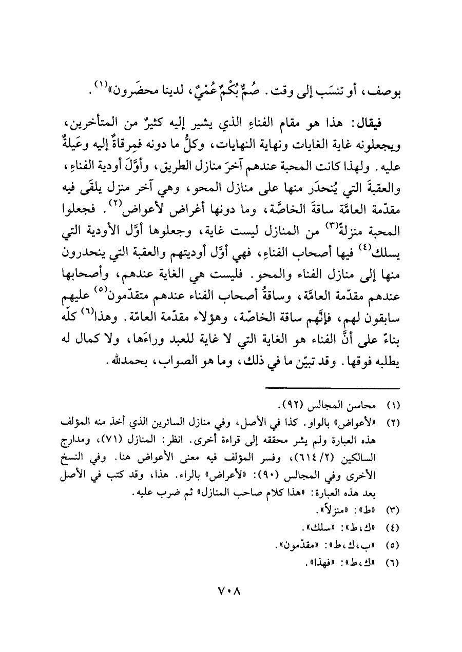 (¬٢) "لأعواض" بالواو. كذا في الأصل، وفي منازل السائرين الذي أخذ منه المؤلف هذه العبارة ولم يشر محققه إلى قراءة أخرى. انظر: المنازل (٧١)، ومدارج السالكين (٢/ ٦١٤)، وفسر المؤلف فيه معنى الأعواض هنا. وفي النسخ الأخرى وفي المجالس (٩٥): "لأعراض" بالراء. هذا، وقد كتب في الأصل بعد هذه العبارة: "هذا كلام صاحب المنازل" ثم ضرب عليه.