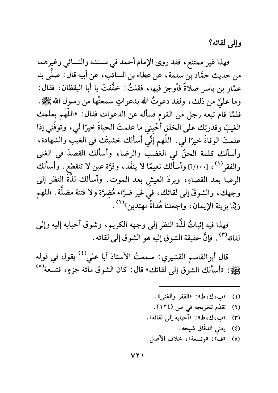 فهذا فيه إثباتُ لذَّة النظر إلى وجهه الكريم، وشوق أحبابه إليه وإلى لقائه (¬٣). فإنَّ حقيقة الشوق إليه هو الشوق إلى لقائه.