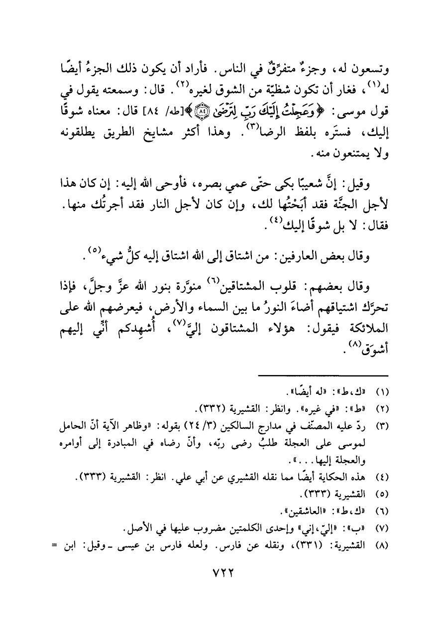 وتسعون له، وجزءٌ متفرِّقٌ في الناس. فأراد أن يكون ذلك الجزءُ أيضًا له (¬١)، فغار أن تكون شظيّة من الشوق لغيره (¬٢). قال: وسمعته يقول في قول موسى: {وَعَجِلْتُ إِلَيْكَ رَبِّ لِتَرْضَى} [طه/ ٨٤] قال: معناه شوقًا إليك، فستَره بلفظ الرضا (¬٣). وهذا أكثر مشايخ الطريق يطلقونه ولا يمتنعون منه.