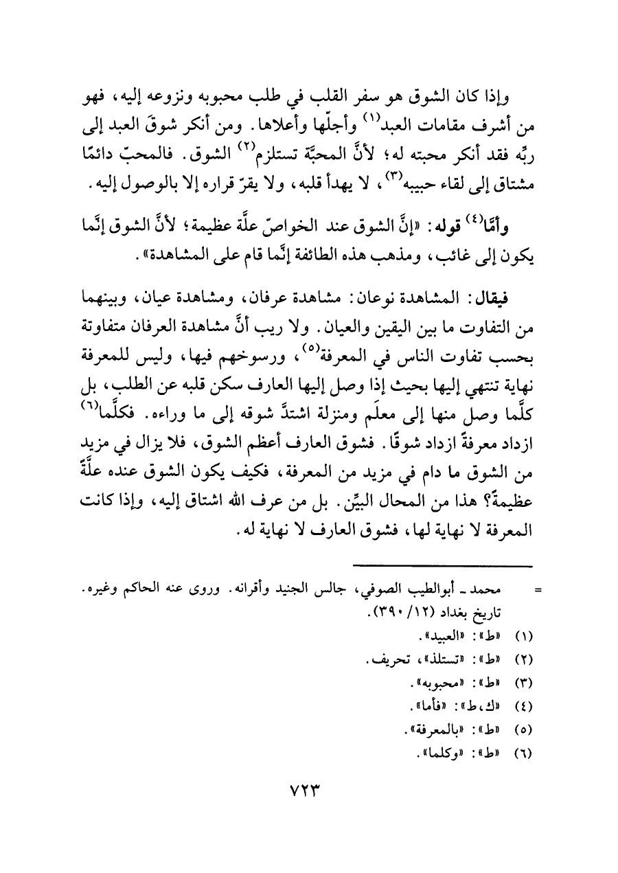 وأمَّا (¬٤) قوله: "إنَّ الشوق عند الخواصّ علَّة عظيمة؛ لأنَّ الشوق إنَّما يكون إلى غائب، ومذهب هذه الطائفة إنَّما قام على المشاهدة".