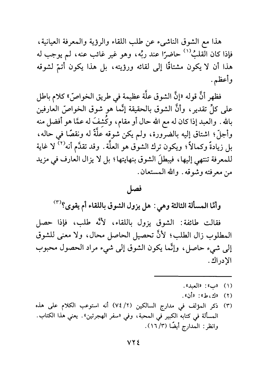 فظهر أنَّ قوله "إنَّ الشوق علَّة عظيمة في طريق الخواصّ" كلام باطل على كلِّ تقدير، وأنَّ الشوق بالحقيقة إنَّما هو شوق الخواصّ العارفين باللَّه. والعبد إذا كان له مع اللَّه حال أو مقام، وكُشِفَ له عمَّا هو أفضل منه وأجلّ؛ اشتاق إليه بالضرورة، ولم يكن شوقه علَّةً له ونقصًا في حاله، بل زيادةً وكمالًا؛ ويكون ترك الشوق هو العلَّة. وقد تقدَّم أنه (¬٢) لا غاية للمعرفة تنتهي إليها، فيبطلَ الشوق بنهايتها؛ بل لا يزال العارف في مزيد من معرفته وشوقه. واللَّه المستعان.