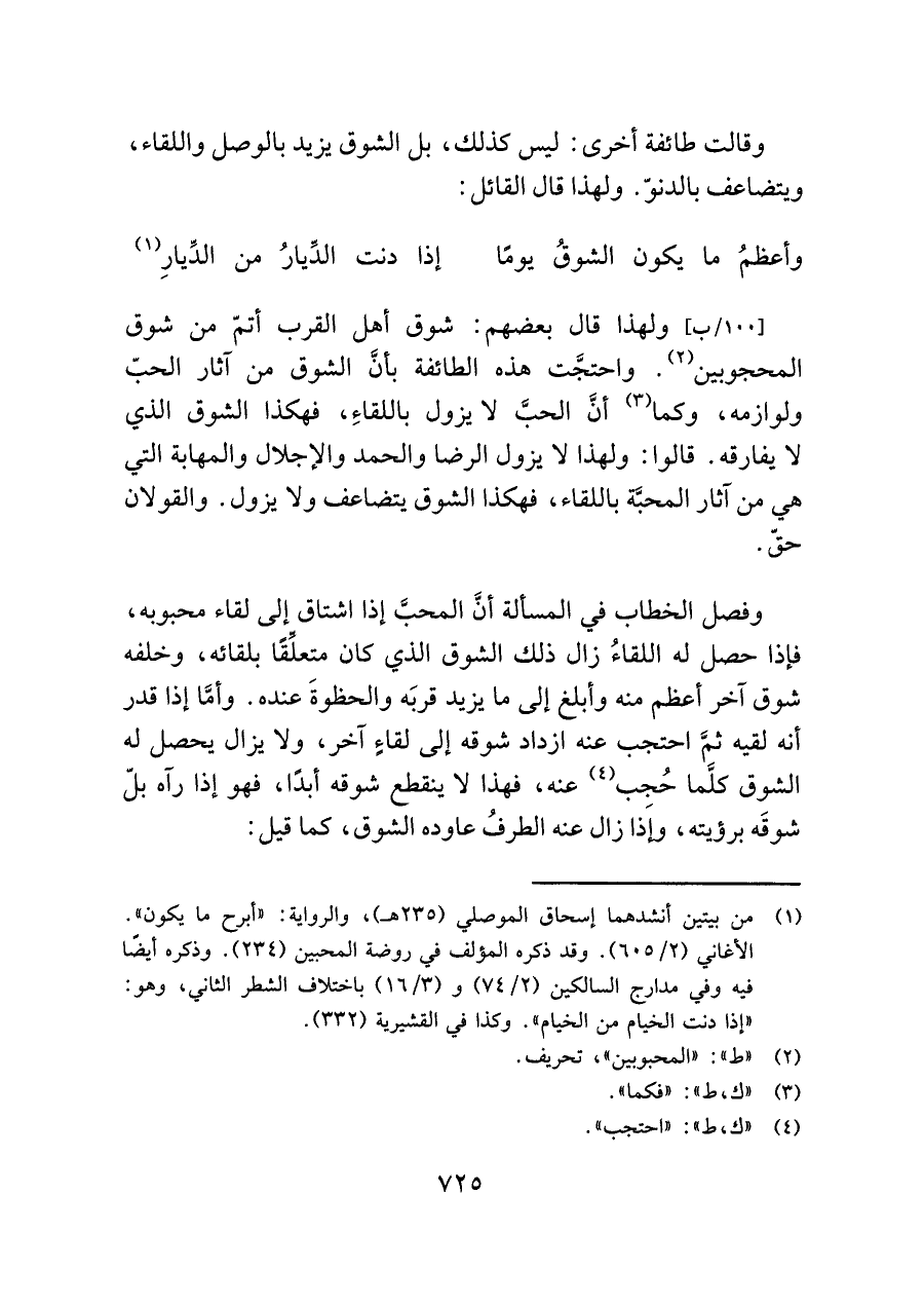 وقالت طائفة أخرى: ليس كذلك، بل الشوق يزيد بالوصل واللقاء، ويتضاعف بالدنوّ. ولهذا قال القائل: