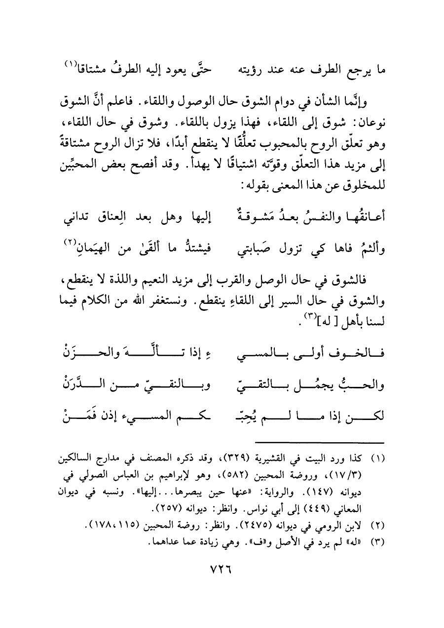 فالشوق في حال الوصل والقرب إلى مزيد النعيم واللذة لا ينقطع، والشوق في حال السير إلى اللقاءِ ينقطع. ونستغفر اللَّه من الكلام فيما لسنا بأهل [له] (¬٣).