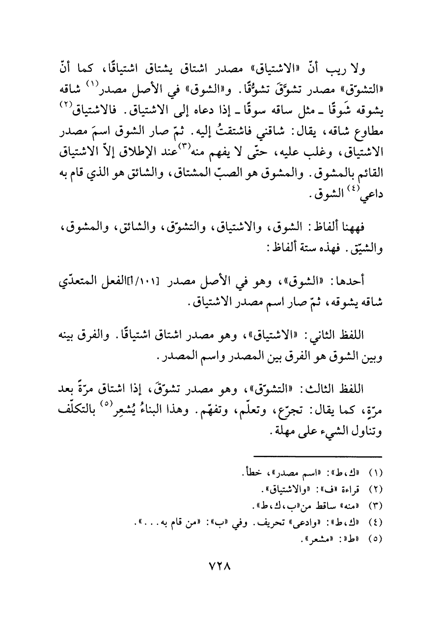 اللفظ الثالث: "التشوّق"، وهو مصدر تشوّقَ، إذا اشتاق مرّةً بعد مرّةٍ، كما يقال: تجرعّ، وتعلّم، وتفهّم. وهذا البناءُ يُشعِر (¬٥) بالتكلّف وتناول الشيء على مهلة.