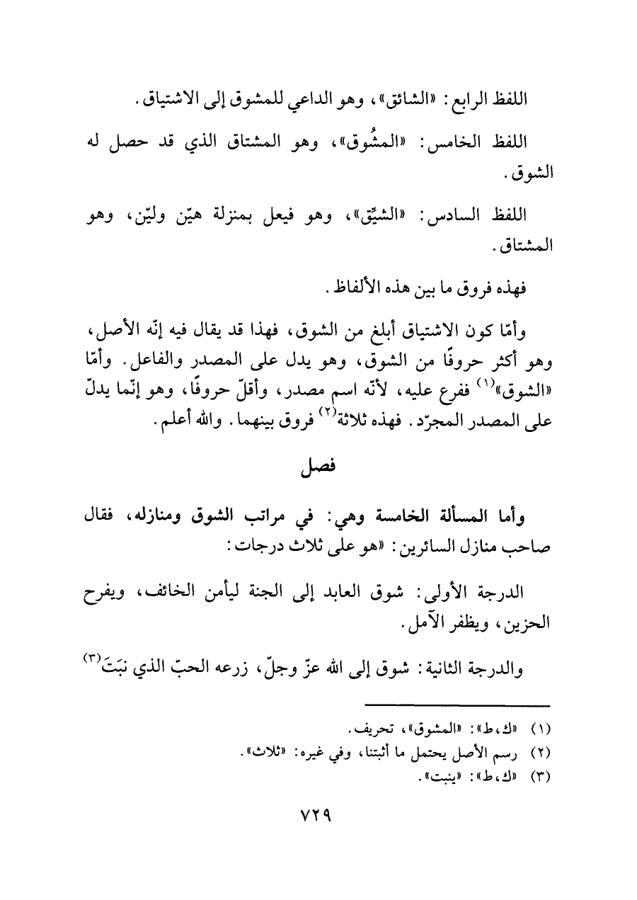 وأمّا كون الاشتياق أبلغ من الشوق، فهذا قد يقال فيه إنّه الأصل، وهو أكثر حروفًا من الشوق، وهو يدل على المصدر والفاعل. وأمّا "الشوق" (¬١) ففرع عليه، لأنه اسم مصدر، وأقلّ حروفًا، وهو إنّما يدلّ على المصدر المجرّد. فهذه ثلاثة (¬٢) فروق بينهما. واللَّه أعلم.