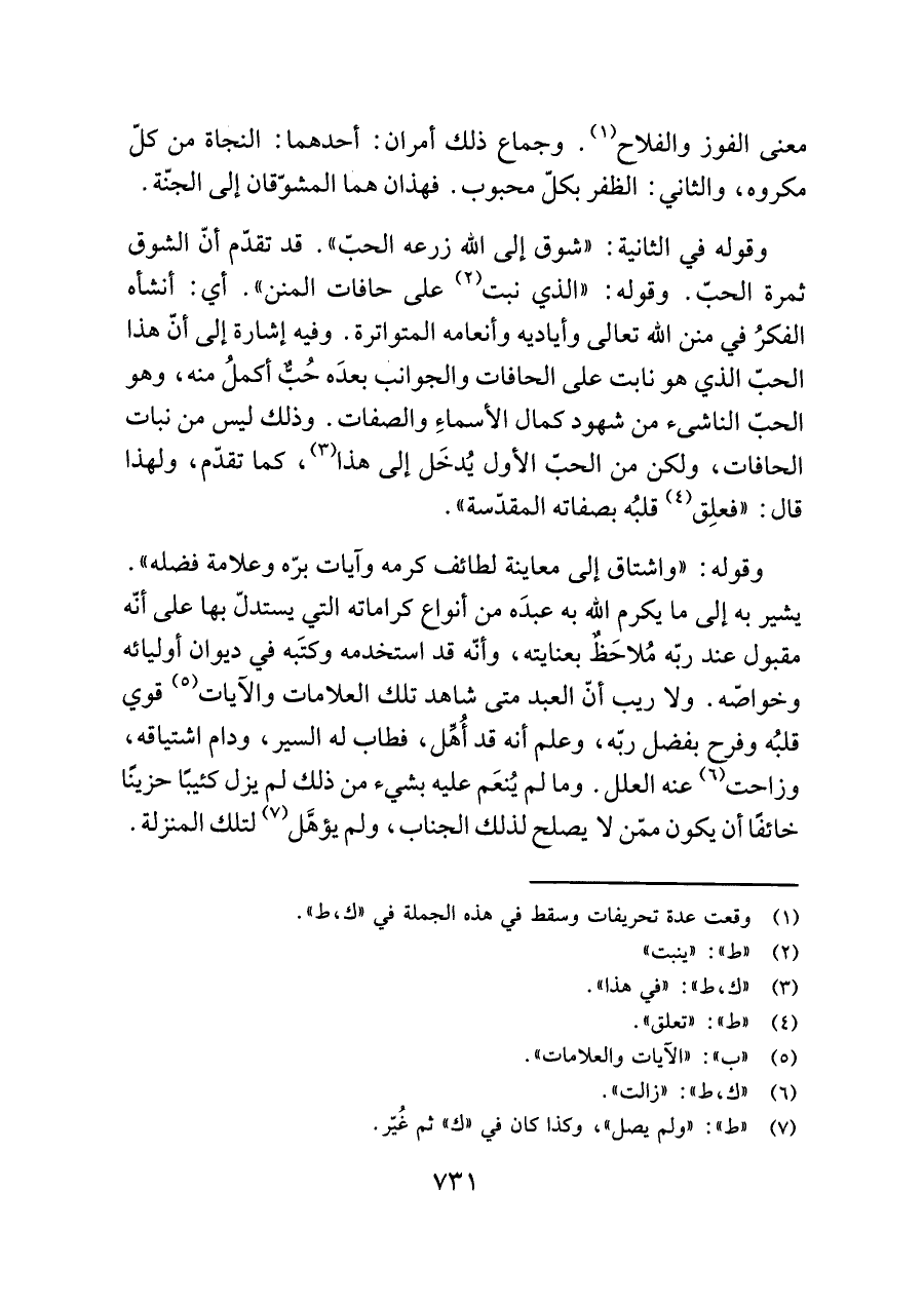 وقوله في الثانية: "شوق إلى اللَّه زرعه الحبّ". قد تقدّم أنّ الشوق ثمرة الحبّ. وقوله: "الذي نبت (¬٢) على حافات المنن". أي: أنشأه الفكرُ في منن اللَّه تعالى وأياديه وأنعامه المتواترة. وفيه إشارة إلى أنّ هذا الحبّ الذي هو نابت على الحافات والجوانب بعدَه حُبٌّ أكملُ منه، وهو الحبّ الناشئ من شهود كمال الأسماءِ والصفات. وذلك ليس من نبات الحافات، ولكن من الحبّ الأول يُدخَل إلى هذا (¬٣)، كما تقدّم، ولهذا قال: "فعلِق (¬٤) قلبُه بصفاته المقدّسة".