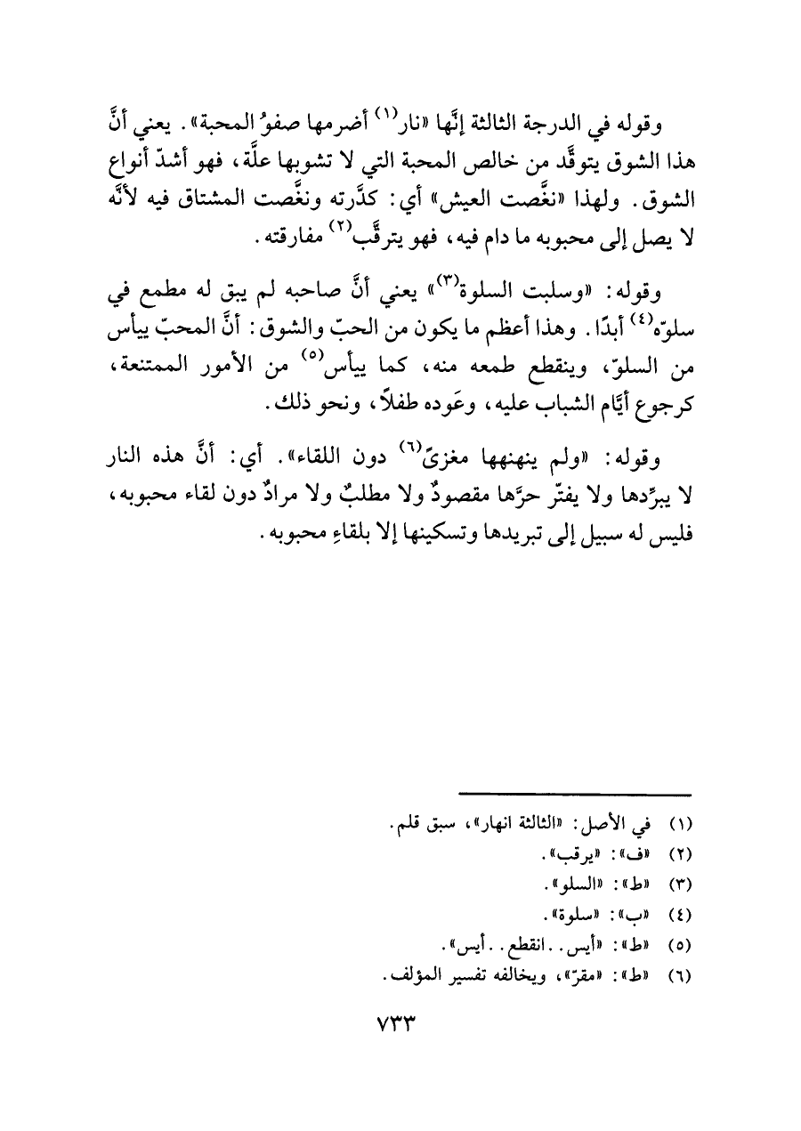 وقوله في الدرجة الثالثة إنَّها "نار (¬١) أضرمها صفوُ المحبة". يعني أنَّ هذا الشوق يتوقَّد من خالص المحبة التي لا تشوبها علَّة، فهو أشدّ أنواع الشوق. ولهذا "نغَّصت العيش" أي: كدَّرته ونغَّصت المشتاق فيه لأنَّه لا يصل إلى محبوبه ما دام فيه، فهو يترقَّب (¬٢) مفارقته.