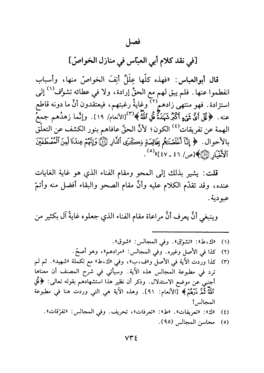 فصل [في نقد كلام أبي العبّاس في منازل الخواصّ]