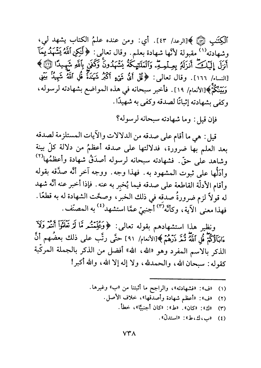 الْكِتَابِ} [الرعد/ ٤٣]. أي: ومن عنده علمُ الكتاب يشهد لي، وشهادته (¬١) مقبولة لأنَّها شهادة بعلم. وقال تعالى: {لَكِنِ اللَّهُ يَشْهَدُ بِمَا أَنْزَلَ إِلَيْكَ أَنْزَلَهُ بِعِلْمِهِ وَالْمَلَائِكَةُ يَشْهَدُونَ وَكَفَى بِاللَّهِ شَهِيدًا (١٦٦)} [النساء/ ١٦٦]. وقال تعالى: {قُلْ أَيُّ شَيْءٍ أَكْبَرُ شَهَادَةً قُلِ اللَّهُ شَهِيدٌ بَيْنِي وَبَيْنَكُمْ} [الأنعام/ ١٩]. فأخبر سبحانه في هذه المواضع بشهادته لرسوله، وكفى بشهادته إثباتًا لصدقه وكفى به شهيدًا.