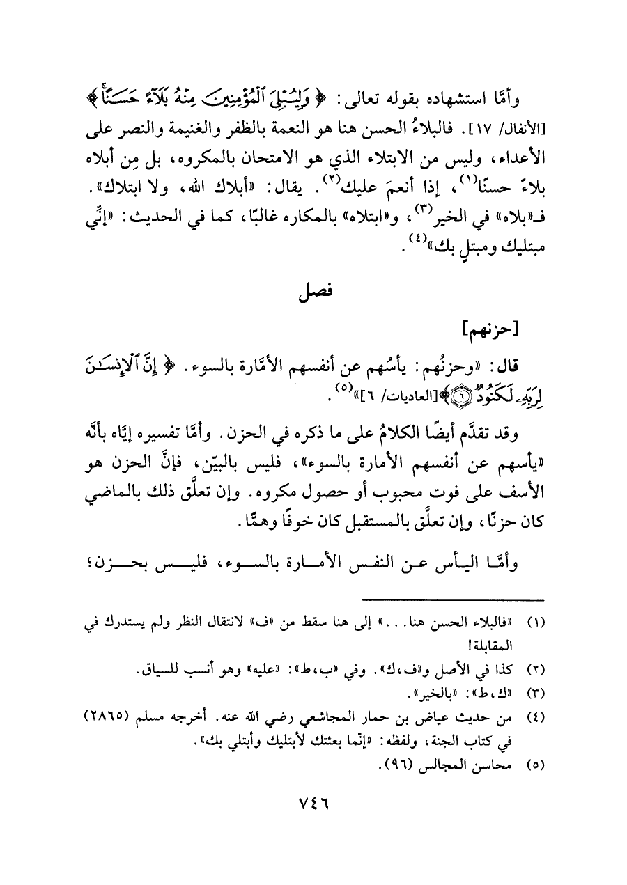 قال: "وحزنُهم: يأسُهم عن أنفسهم الأمَّارة بالسوء. {إِنَّ الْإِنْسَانَ لِرَبِّهِ لَكَنُودٌ (٦)} [العاديات/ ٦] " (¬٥).