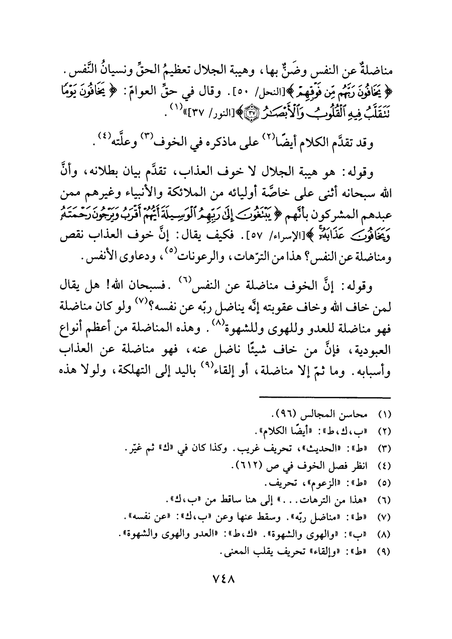 وقوله: هو هيبة الجلال لا خوف العذاب، تقدَّم بيان بطلانه، وأنَّ اللَّه سبحانه أثنى على خاصَّة أوليائه من الملائكة والأنبياء وغيرهم ممن عبدهم المشركون بأنَّهم {يَبْتَغُونَ إِلَى رَبِّهِمُ الْوَسِيلَةَ أَيُّهُمْ أَقْرَبُ وَيَرْجُونَ رَحْمَتَهُ وَيَخَافُونَ عَذَابَهُ} [الإسراء/ ٥٧]. فكيف يقال: إنَّ خوف العذاب نقص ومناضلة عن النفس؟ هذا من الترّهات، والرعونات (¬٥)، ودعاوى الأنفس.