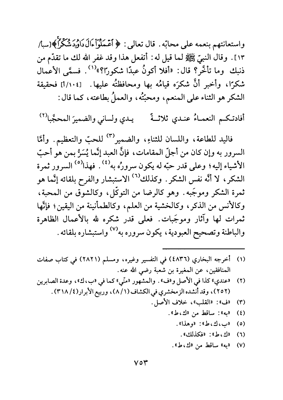 واستعانتهم بنعمه على محابّه. قال تعالى: {اعْمَلُوا آلَ دَاوُودَ شُكْرًا} [سبأ/ ١٣]. وقال النبيّ -صلى اللَّه عليه وسلم- لما قيل له: أتفعل هذا وقد غفر اللَّه لك ما تقدّم من ذنبك وما تأخَّر؟ قال: "أفلا أكونُ عبدًا شكورًا؟ " (¬١). فسمَّى الأعمال شكرًا، وأخبر أنَّ شكرَه قيامُه بها ومحافظتُه عليها. فحقيقة الشكر هو الثناء على المنعم، ومحبّتُه، والعملُ بطاعته، كما قال: