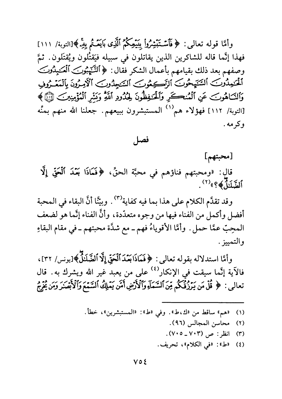 قال: "ومحبتهم فناؤهم في محبَّة الحقِّ، {فَمَاذَا بَعْدَ الْحَقِّ إِلَّا الضَّلَالُ}؟ " (¬٢).