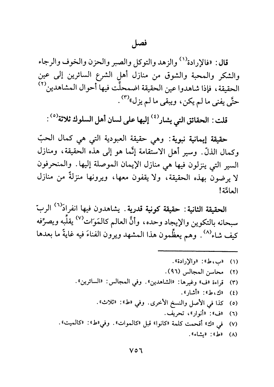 قال: "فالإرادة (¬١) والزهد والتوكل والصبر والحزن والخوف والرجاء والشكر والمحبة والشوق من منازل أهل الشرع السائرين إلى عين الحقيقة، فإذا شاهدوا عين الحقيقة اضمحلَّت فيها أحوال المشاهدين (¬٢) حتَّى يفنى ما لم يكن، ويبقى ما لم يزل" (¬٣).