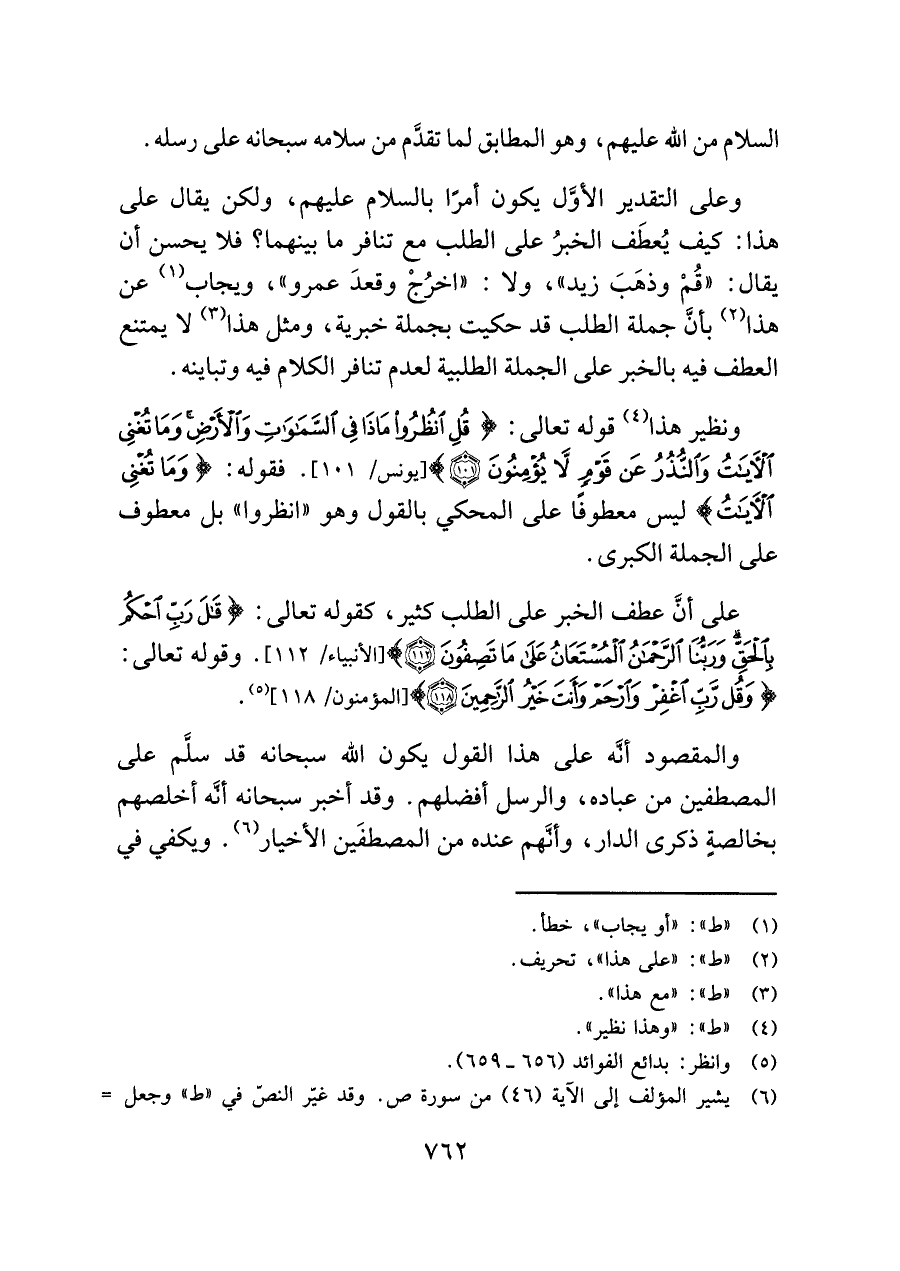 وعلى التقدير الأوَّل يكون أمرًا بالسلام عليهم، ولكن يقال على هذا: كيف يُعطَف الخبرُ على الطلب مع تنافر ما بينهما؟ فلا يحسن أن يقال: "قُمْ وذهَبَ زيد"، ولا: "اخرُجْ وقعدَ عمرو"، ويجاب (¬١) عن هذا (¬٢) بأنَّ جملة الطلب قد حكيت بجملة خبرية، ومثل هذا (¬٣) لا يمتنع العطف فيه بالخبر على الجملة الطلبية لعدم تنافر الكلام فيه وتباينه.