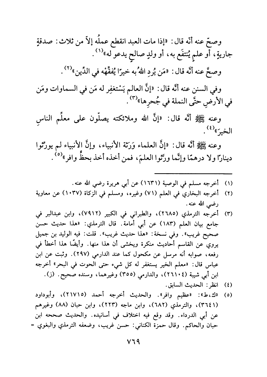 (¬٣) أخرجه الترمذي (٢٦٨٥)، والطبراني في الكبير (٧٩١٢)، وابن عبد البر في جامع بيان العلم (١٨٣) عن أبي أمامة. قال الترمذي: "هذا حديث حسن صحيح غريب". وفي نسخة: "هذا حديث غريب". قلت: فيه الوليد بن جميل يروي عن القاسم أحاديث منكرة ويخشي أن هذا منها. وأيضًا هذا أخطأ في رفعه، صوابه أنه مرسل عن مكحول كما عند الدارمي (٢٩٧). وثبت عن ابن عباس قال: "معلم الخير يستغفر له كل شيء حتى الحوت في البحر" أخرجه ابن أبي شيبة (٢٦١٠٤)، والدارمي (٣٥٥) وغيرهما، وسنده صحيح. (ز).