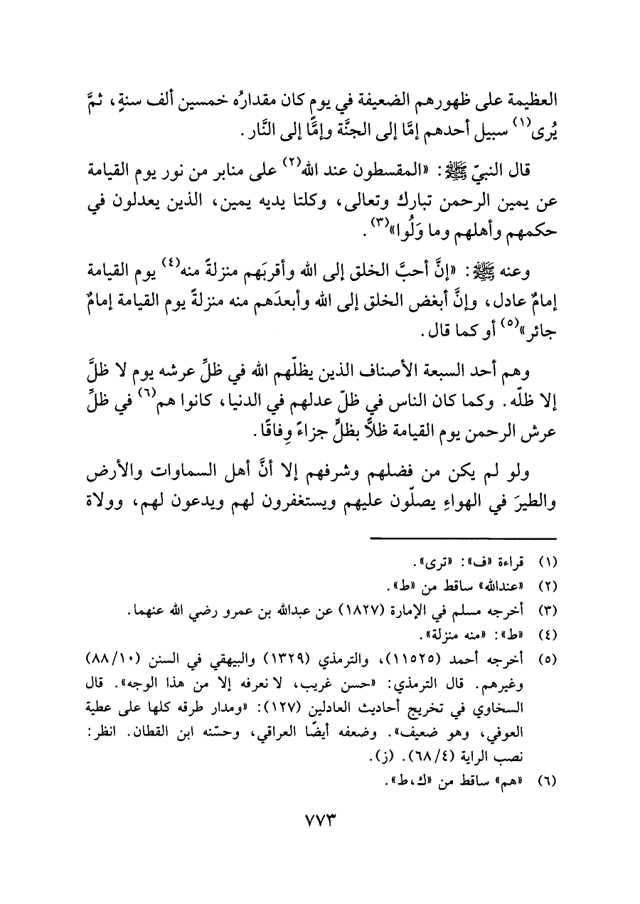 وهم أحد السبعة الأصناف الذين يظلّهم اللَّه في ظل عرشه يوم لا ظلَّ إلا ظلّه. وكما كان الناس في ظلّ عدلهم في الدنيا، كانوا هم (¬٦) في ظل عرش الرحمن يوم القيامة ظلًّا بظلٍّ جزاءً وِفاقًا.