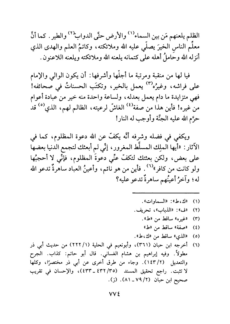الظلم يلعنهم مَن بين السماء (¬١) والأرض حتَّى الدوابّ (¬٢) والطير. كما أنَّ معلِّم الناسِ الخيرَ يصلّي عليه اللَّه وملائكته، وكاتمُ العلم والهدى الذي أنزله اللَّه وحاملُ أهله على كتمانه يلعنه اللَّه وملائكته ويلعنه اللاعنون.