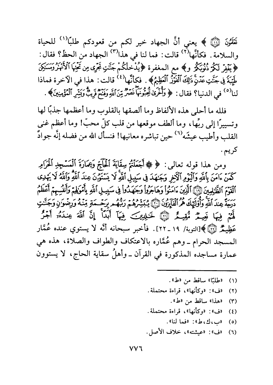 ومن هذا قوله تعالى: {أَجَعَلْتُمْ سِقَايَةَ الْحَاجِّ وَعِمَارَةَ الْمَسْجِدِ الْحَرَامِ كَمَنْ آمَنَ بِاللَّهِ وَالْيَوْمِ الْآخِرِ وَجَاهَدَ فِي سَبِيلِ اللَّهِ لَا يَسْتَوُونَ عِنْدَ اللَّهِ وَاللَّهُ لَا يَهْدِي الْقَوْمَ الظَّالِمِينَ (١٩) الَّذِينَ آمَنُوا وَهَاجَرُوا وَجَاهَدُوا فِي سَبِيلِ اللَّهِ بِأَمْوَالِهِمْ وَأَنْفُسِهِمْ أَعْظَمُ دَرَجَةً عِنْدَ اللَّهِ وَأُولَئِكَ هُمُ الْفَائِزُونَ (٢٠) يُبَشِّرُهُمْ رَبُّهُمْ بِرَحْمَةٍ مِنْهُ وَرِضْوَانٍ وَجَنَّاتٍ لَهُمْ فِيهَا نَعِيمٌ مُقِيمٌ (٢١) خَالِدِينَ فِيهَا أَبَدًا إِنَّ اللَّهَ عِنْدَهُ أَجْرٌ عَظِيمٌ (٢٢)} [التوبة/ ١٩ - ٢٢]. فأخبر سبحانه أنَّه لا يستوي عنده عُمَّار المسجد الحرام -وهم عُمَّاره بالاعتكاف والطواف والصلاة، هذه هي عمارة مساجده المذكورة في القرآن- وأهلُ سقاية الحاج، لا يستوون