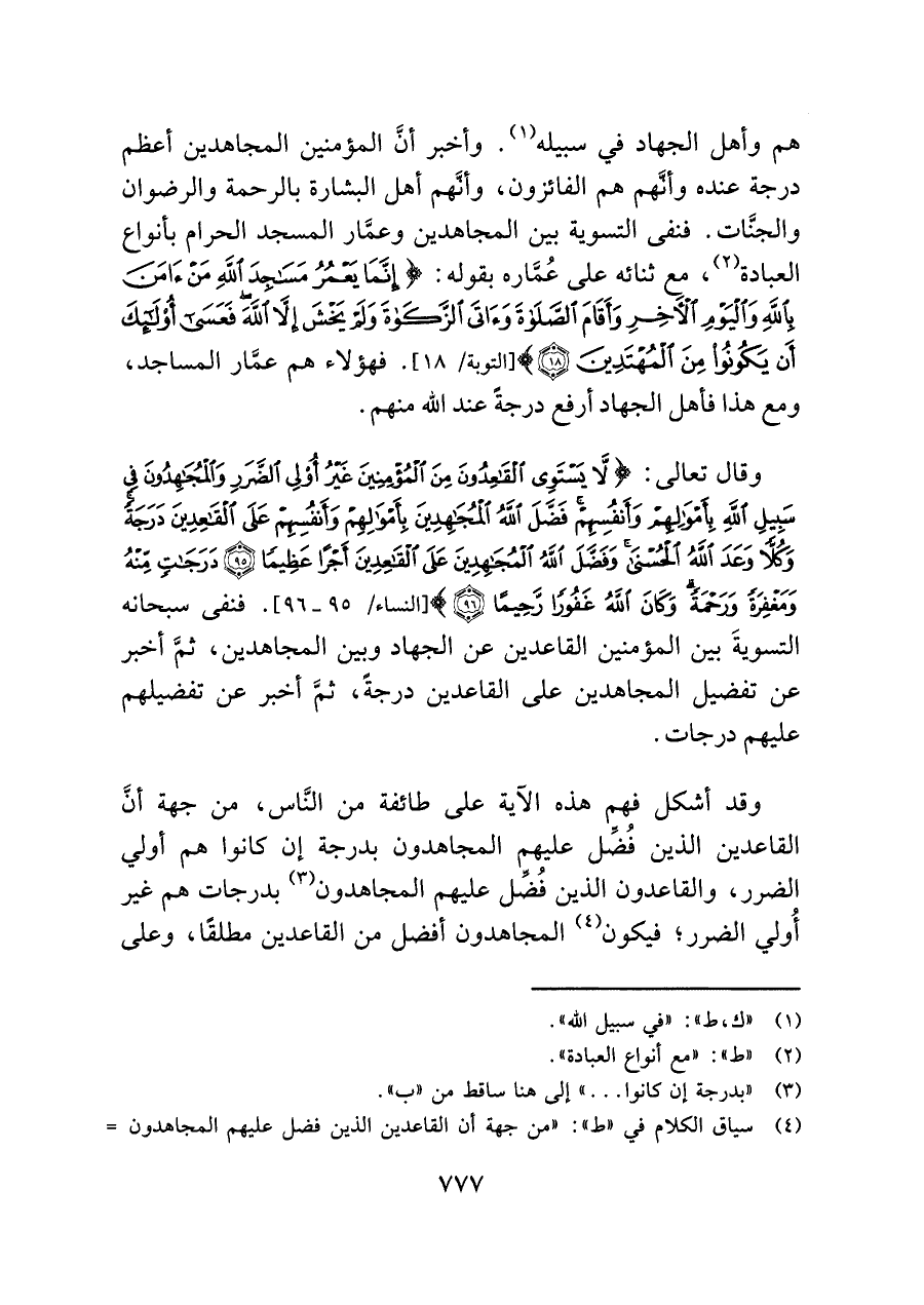 وقال تعالى: {لَا يَسْتَوِي الْقَاعِدُونَ مِنَ الْمُؤْمِنِينَ غَيْرُ أُولِي الضَّرَرِ وَالْمُجَاهِدُونَ فِي سَبِيلِ اللَّهِ بِأَمْوَالِهِمْ وَأَنْفُسِهِمْ فَضَّلَ اللَّهُ الْمُجَاهِدِينَ بِأَمْوَالِهِمْ وَأَنْفُسِهِمْ عَلَى الْقَاعِدِينَ دَرَجَةً وَكُلًّا وَعَدَ اللَّهُ الْحُسْنَى وَفَضَّلَ اللَّهُ الْمُجَاهِدِينَ عَلَى الْقَاعِدِينَ أَجْرًا عَظِيمًا (٩٥) دَرَجَاتٍ مِنْهُ وَمَغْفِرَةً وَرَحْمَةً وَكَانَ اللَّهُ غَفُورًا رَحِيمًا (٩٦)} [النساء/ ٩٥ - ٩٦]. فنفى سبحانه التسويةَ بين المؤمنين القاعدين عن الجهاد وبين المجاهدين، ثمَّ أخبر عن تفضيل المجاهدين على القاعدين درجة، ثمَّ أخبر عن تفضيلهم عليهم درجات.