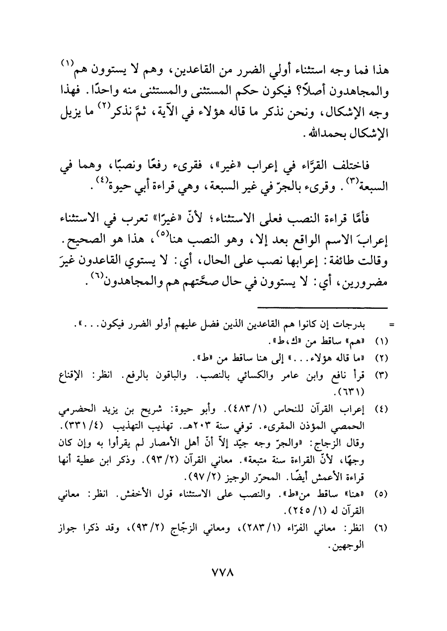 فأمَّا قراءة النصب فعلى الاستثناء؛ لأنّ "غيرًا" تعرب في الاستثناء إعرابَ الاسم الواقع بعد إلا، وهو النصب هنا (¬٥)، هذا هو الصحيح. وقالت طائفة: إعرابها نصب على الحال، أي: لا يستوي القاعدون غيرَ مضرورين، أي: لا يستوون في حال صحَّتهم هم والمجاهدون (¬٦).