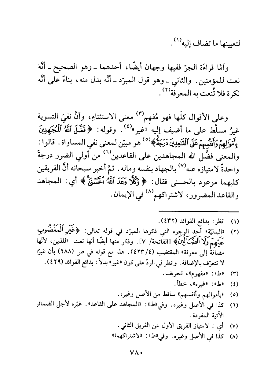 (¬٢) "البدليّةِ" أحد الوجوه التي ذكرها المبرّد في قوله تعالى: {غَيْرِ الْمَغْضُوبِ عَلَيْهِمْ وَلَا الضَّالِّينَ} [الفاتحة/ ٧]. وذكر منها أيضًا أنها نعت "للذين، لأنّها مضافة إلى معرفة" المقتضب (٤/ ٤٢٣). هذا مع قوله في ص (٢٨٨) بأن غيرًا لا تتعرّف بالإضافة. وانظر في الردّ على كون "غير" بدلًا: بدائع الفوائد (٤٢٩).