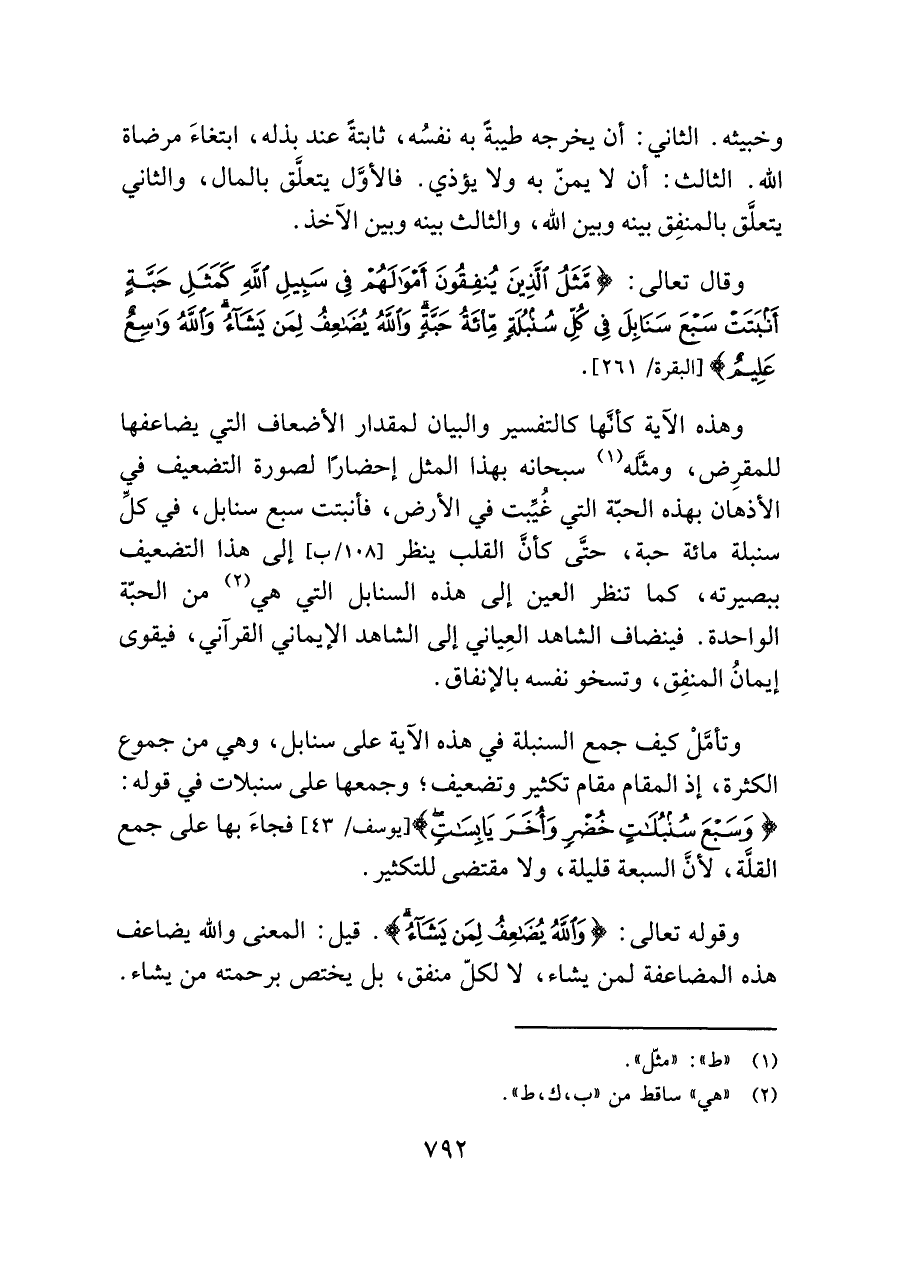 وهذه الآية كأنَّها كالتفسير والبيان لمقدار الأضعاف التي يضاعفها للمقرِض، ومثَّله (¬١) سبحانه بهذا المثل إحضارًا لصورة التضعيف في الأذهان بهذه الحبّة التي غُيِّبت في الأرض، فأنبتت سبع سنابل، في كلِّ سنبلة مائة حبة، حتَّى كأنَّ القلب ينظر إلى هذا التضعيف ببصيرته، كما تنظر العين إلى هذه السنابل التي هي (¬٢) من الحبّة الواحدة. فينضاف الشاهد العِياني إلى الشاهد الإيماني القرآني، فيقوي إيمانُ المنفِق، وتسخو نفسه بالإنفاق.