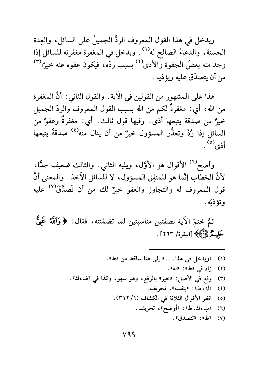 وأصح (¬٦) الأقوال هو الأوَّل، ويليه الثاني. والثالث ضعيف جدًّا، لأنَّ الخطاب إنَّما هو للمنفِق المسؤول، لا للسائل الآخذ. والمعنى أنَّ قول المعروف له والتجاوز والعفو خيرٌ لك من أن تَصدَّقَ (¬٧) عليه وتؤذيَه.