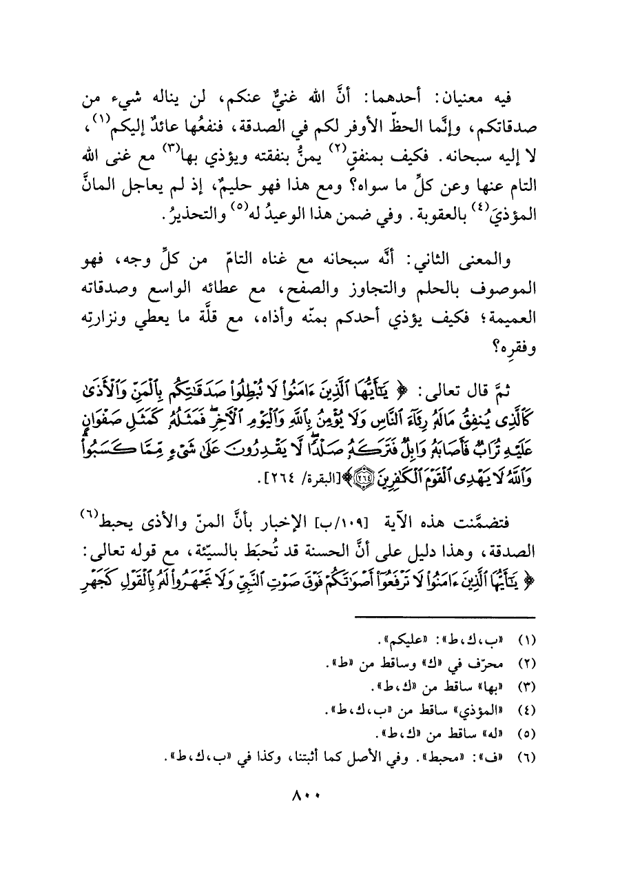 فتضمَّنت هذه الآية الإخبار بأنَّ المنّ والأذى يحبط (¬٦) الصدقة، وهذا دليل على أنَّ الحسنة قد تُحبَط بالسيّئة، مع قوله تعالى: {يَاأَيُّهَا الَّذِينَ آمَنُوا لَا تَرْفَعُوا أَصْوَاتَكُمْ فَوْقَ صَوْتِ النَّبِيِّ وَلَا تَجْهَرُوا لَهُ بِالْقَوْلِ كَجَهْرِ