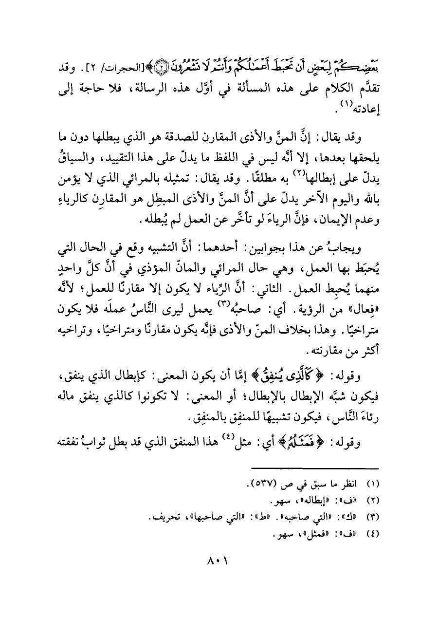 وقد يقال: إنَّ المنَّ والأذى المقارن للصدقة هو الذي يبطلها دون ما يلحقها بعدها، إلا أنَّه ليس في اللفظ ما يدلّ على هذا التقييد، والسياقُ يدلّ على إبطالها (¬٢) به مطلقًا. وقد يقال: تمثيله بالمرائي الذي لا يؤمن باللَّه واليوم الآخر يدل على أنَّ المنَّ والأذى المبطِل هو المقارِن كالرياءِ وعدم الإيمان، فإنَّ الرياءَ لو تأخَّر عن العمل لم يُبطله.