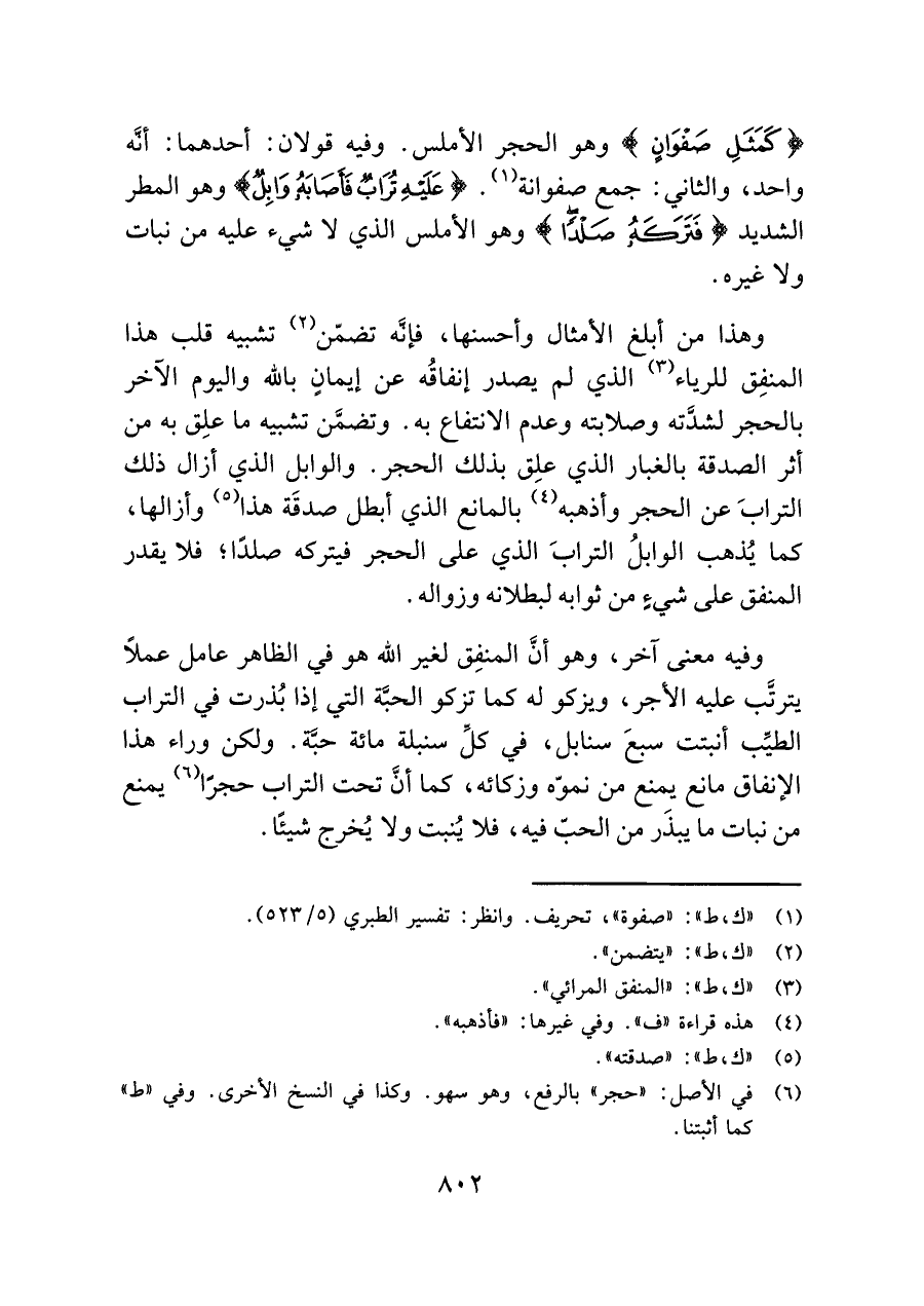 وهذا من أبلغ الأمثال وأحسنها، فإنَّه تضمّن (¬٢) تشبيه قلب هذا المنفِق للرياء (¬٣) الذي لم يصدر إنفاقُه عن إيمانٍ باللَّه واليوم الآخر بالحجر لشدَّته وصلابته وعدم الانتفاع به. وتضمَّن تشبيه ما علِق به من أثر الصدقة بالغبار الذي علِق بذلك الحجر. والوابل الذي أزال ذلك الترابَ عن الحجر وأذهبه (¬٤) بالمانع الذي أبطل صدقَة هذا (¬٥) وأزالها، كما يُذهب الوابلُ الترابَ الذي على الحجر فيتركه صلدًا؛ فلا يقدر المنفق على شيءٍ من ثوابه لبطلانه وزواله.
