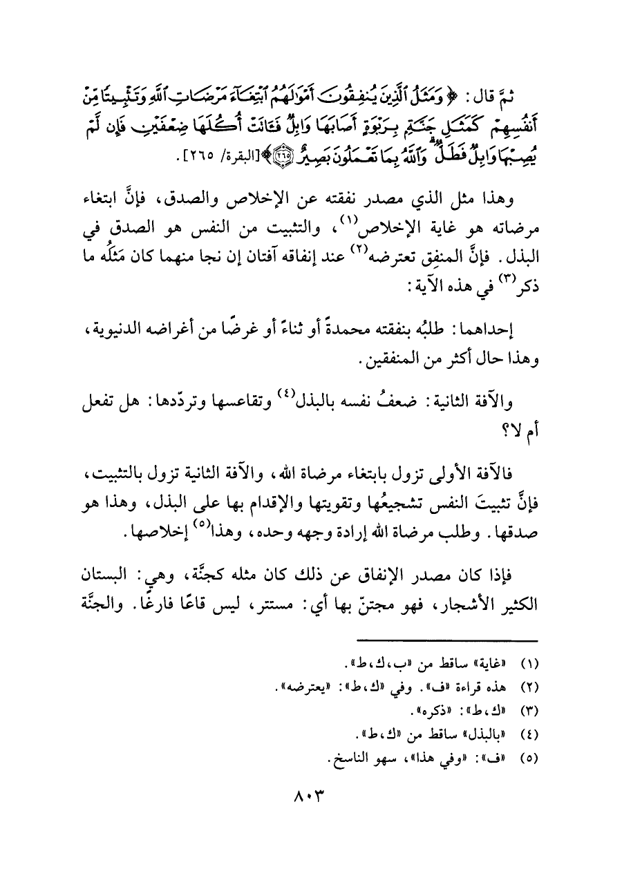 وهذا مثل الذي مصدر نفقته عن الإخلاص والصدق، فإنَّ ابتغاء مرضاته هو غاية الإخلاص (¬١)، والتثبيت من النفس هو الصدق في البذل. فإنَّ المنفِق تعترضه (¬٢) عند إنفاقه آفتان إن نجا منهما كان مَثلُه ما ذكر (¬٣) في هذه الآية: