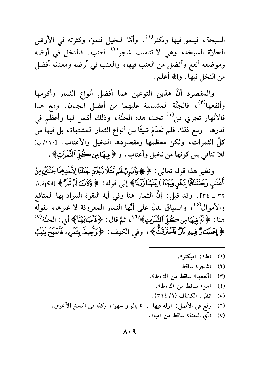 السبخة، فينمو فيها ويكثر (¬١). وأمَّا النخيل فنموّه وكثرته في الأرض الحارَّة السبخة، وهي لا تناسب شجر (¬٢) العنب. فالنخل في أرضه وموضعه أنفع وأفضل من العنب فيها، والعنب في أرضه ومعدنه أفضل من النخل فيها. واللَّه أعلم.