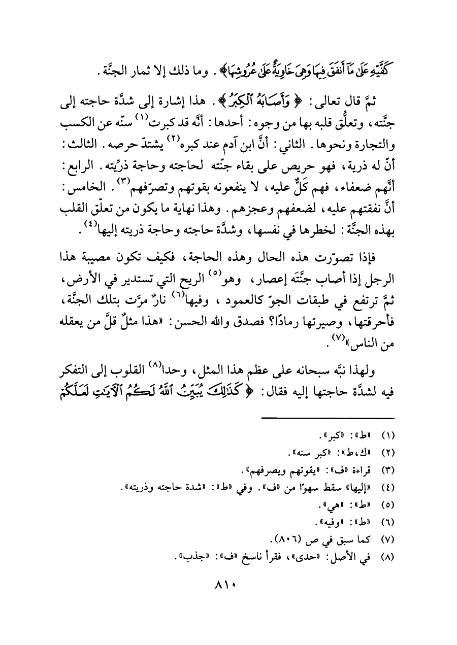 ثمَّ قال تعالى: {وَأَصَابَهُ الْكِبَرُ}. هذا إشارة إلى شدَّة حاجته إلى جنَّته، وتعلُّق قلبه بها من وجوه: أحدها: أنَّه قد كبرت (¬١) سنّه عن الكسب والتجارة ونحوها. الثاني: أنَّ ابن آدم عند كبره (¬٢) يشتدّ حرصه. الثالث: أنّ له ذرية، فهو حريص على بقاء جنّته لحاجته وحاجة ذرِّيته. الرابع: أنَّهم ضعفاء، فهم كَلٌّ عليه، لا ينفعونه بقوتهم وتصرّفهم (¬٣). الخامس: أنَّ نفقتهم عليه، لضعفهم وعجزهم. وهذا نهاية ما يكون من تعلّق القلب بهذه الجنَّة: لخطرها في نفسها، وشدَّة حاجته وحاجة ذريته إليها (¬٤).