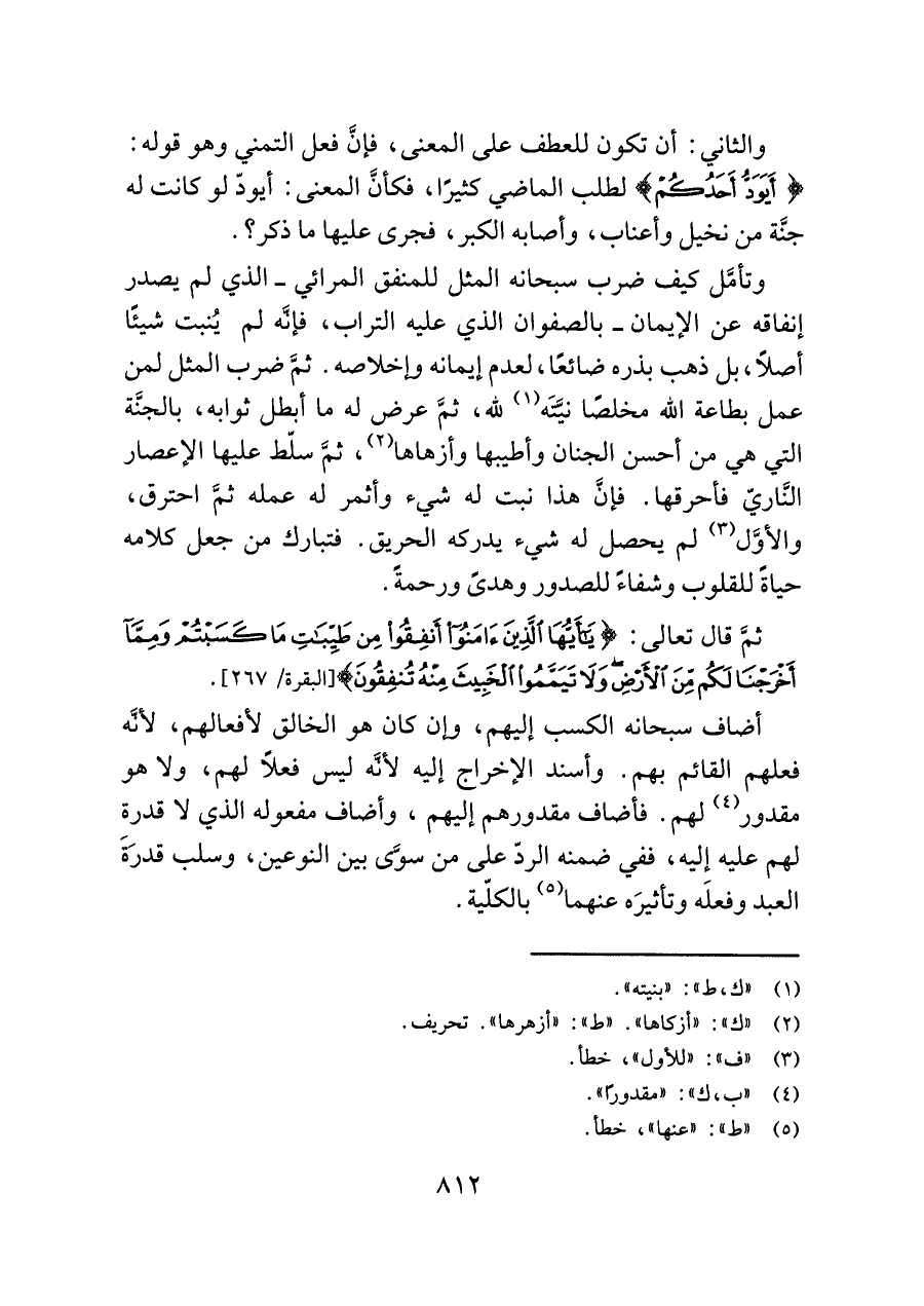 وتأمَّل كيف ضرب سبحانه المثل للمنفق المرائي -الذي لم يصدر إنفاقه عن الإيمان- بالصفوان الذي عليه التراب، فإنَّه لم يُنبت شيئًا أصلًا، بل ذهب بذره ضائعًا، لعدم إيمانه وإخلاصه. ثمَّ ضرب المثل لمن عمل بطاعة اللَّه مخلصًا نيَّتَه (¬١) للَّه، ثمَّ عرض له ما أبطل ثوابه، بالجنَّة التي هي من أحسن الجنان وأطيبها وأزهاها (¬٢)، ثمَّ سلّط عليها الإعصار النَّاريّ فأحرقها. فإنَّ هذا نبت له شيء وأثمر له عمله ثمَّ احترق، والأوَّل (¬٣) لم يحصل له شيء يدركه الحريق. فتبارك من جعل كلامه حياةً للقلوب وشفاءً للصدور وهدًى ورحمةً.