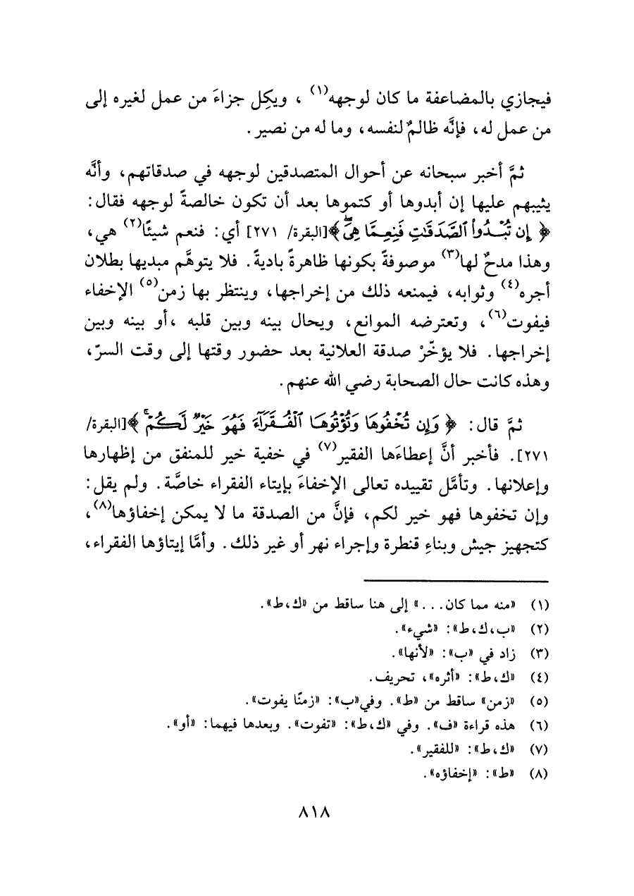ثمَّ أخبر سبحانه عن أحوال المتصدقين لوجهه في صدقاتهم، وأنَّه يثيبهم عليها إن أبدوها أو كتموها بعد أن تكون خالصةً لوجهه فقال: {إِنْ تُبْدُوا الصَّدَقَاتِ فَنِعِمَّا هِيَ} [البقرة/ ٢٧١] أي: فنعم شيئًا (¬٢) هي، وهذا مدحٌ لها (¬٣) موصوفةً بكونها ظاهرةً باديةً. فلا يتوهَّم مبديها بطلان أجره (¬٤) وثوابه، فيمنعه ذلك من إخراجها، وينتظر بها زمن (¬٥) الإخفاء فيفوت (¬٦)، وتعترضه الموانع، ويحال بينه وبين قلبه، أو بينه وبين إخراجها. فلا يؤخّرْ صدقة العلانية بعد حضور وقتها إلى وقت السرّ، وهذه كانت حال الصحابة رضي اللَّه عنهم.