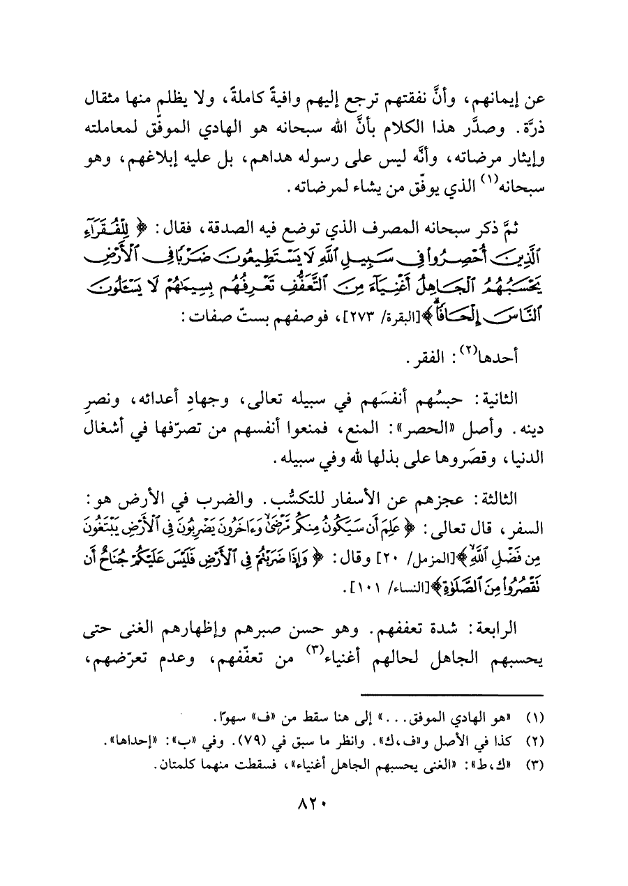 ثمَّ ذكر سبحانه المصرف الذي توضع فيه الصدقة، فقال: {لِلْفُقَرَاءِ الَّذِينَ أُحْصِرُوا فِي سَبِيلِ اللَّهِ لَا يَسْتَطِيعُونَ ضَرْبًا فِي الْأَرْضِ يَحْسَبُهُمُ الْجَاهِلُ أَغْنِيَاءَ مِنَ التَّعَفُّفِ تَعْرِفُهُمْ بِسِيمَاهُمْ لَا يَسْأَلُونَ النَّاسَ إِلْحَافًا} [البقرة/ ٢٧٣]، فوصفهم بستّ صفات: